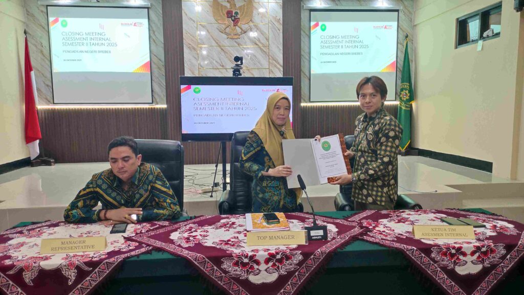 Brebes, 16 Oktober 2025 Pengadilan Negeri Brebes Kelas IB melaksanakan Closing Meeting Asessnebt Internal Pengawasan Bidang Semester ke 2 tahun 2025 dalam rangka program Sertifikasi Mutu Pengadilan Unggul dan Tangguh (AMPUH). Kegiatan ini dipimpin oleh Ketua Pengadilan Negeri Brebes ibu Erica Mardaleni, S.H., M.H. selaku Top Manager, bersama Bapak Kukuh Kurniawan, S.H., M.H. selaku QMR […]