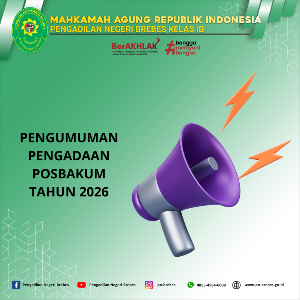 Surat Pengumuman Nomor : 02/PBJ.PN.W12.U11/PL1.1.5/XII/2025 Berdasarkan amanat Pasal 23 Peraturan Mahkamah Agung RI Nomor 1 Tahun 2014tentang Pedoman Pemberian Layanan Hukum Bagi Masyarakat Tidak Mampu di Pengadilan,dengan ini Pengadilan Negeri Brebes membuka Pendaftaran Calon Penyedia Jasa Pos bantuanHukum (POSBAKUM) Tahun Anggaran 2026, ketentuan lebih lanjut dapat dilihat pada link berikut ini : PENGUMUMAN POSBAKUM 2026
