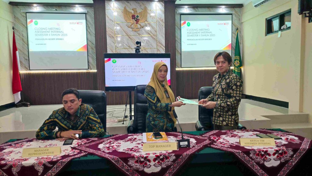 Pengadilan Negeri Brebes Kelas IB melaksanakan Closing Meeting Asessnebt Internal Pengawasan Bidang Semester ke 2 tahun 2025 dalam rangka program Sertifikasi Mutu Pengadilan Unggul dan Tangguh (AMPUH). Kegiatan ini dipimpin oleh Ketua Pengadilan Negeri Brebes ibu Erica Mardaleni, S.H., M.H. selaku Top Manager, bersama Bapak Kukuh Kurniawan, S.H., M.H. selaku QMR dan Bapak Imam Munandar, S.H., M.H. selaku Ketua Tim Assesment Internal.