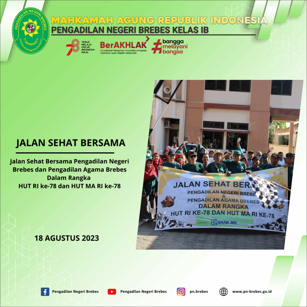 Brebes, 18 Agustus 2023. Jalan Sehat Bersama Pengadilan Negeri Brebes dan Pengadilan Agama Brebes Dalam Rangka HUT RI ke-78 dan