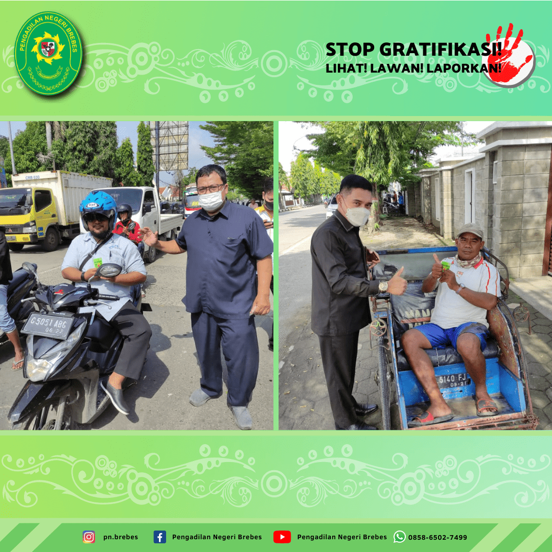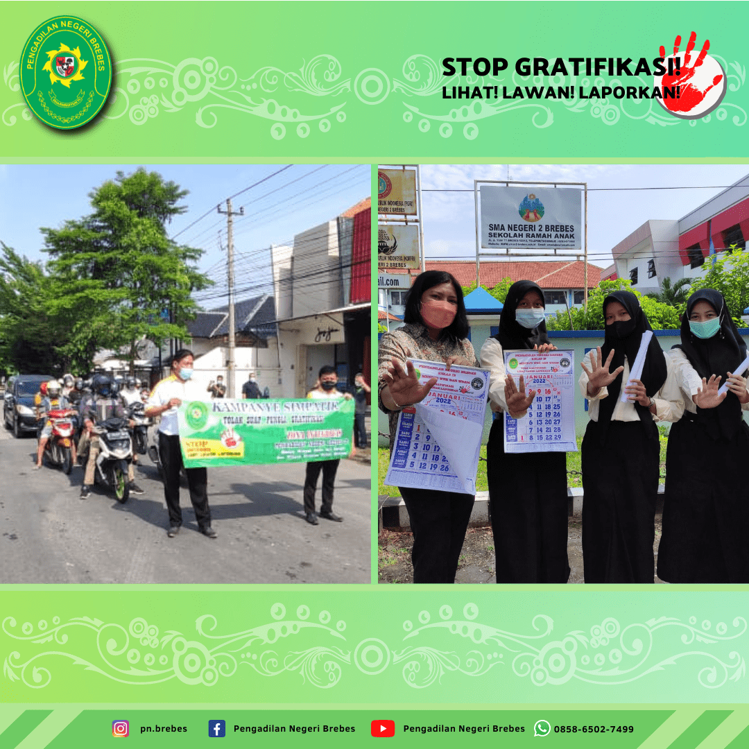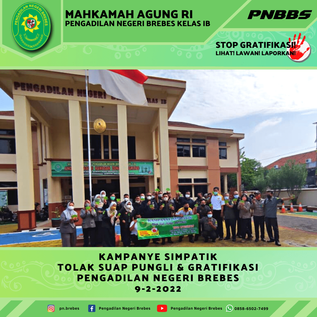Pengadilan Negeri Brebes Kelas IB melaksanakan Kegiatan Kampanye Tolak Gratifikasi dalam mendukung Pembangunan Zona Integritas WBK (Wilayah Bebas Korupsi) dan WBBM (Wilayah Birokrasi Bersih Melayani) pada Pengadilan Negeri Brebes. Pada kegiatan ini Pengadilan Negeri Brebes menyampaikan dalam memberikan pelayanan, harus Bersih dari Korupsi, Kolusi dan Nepotisme (KKN).