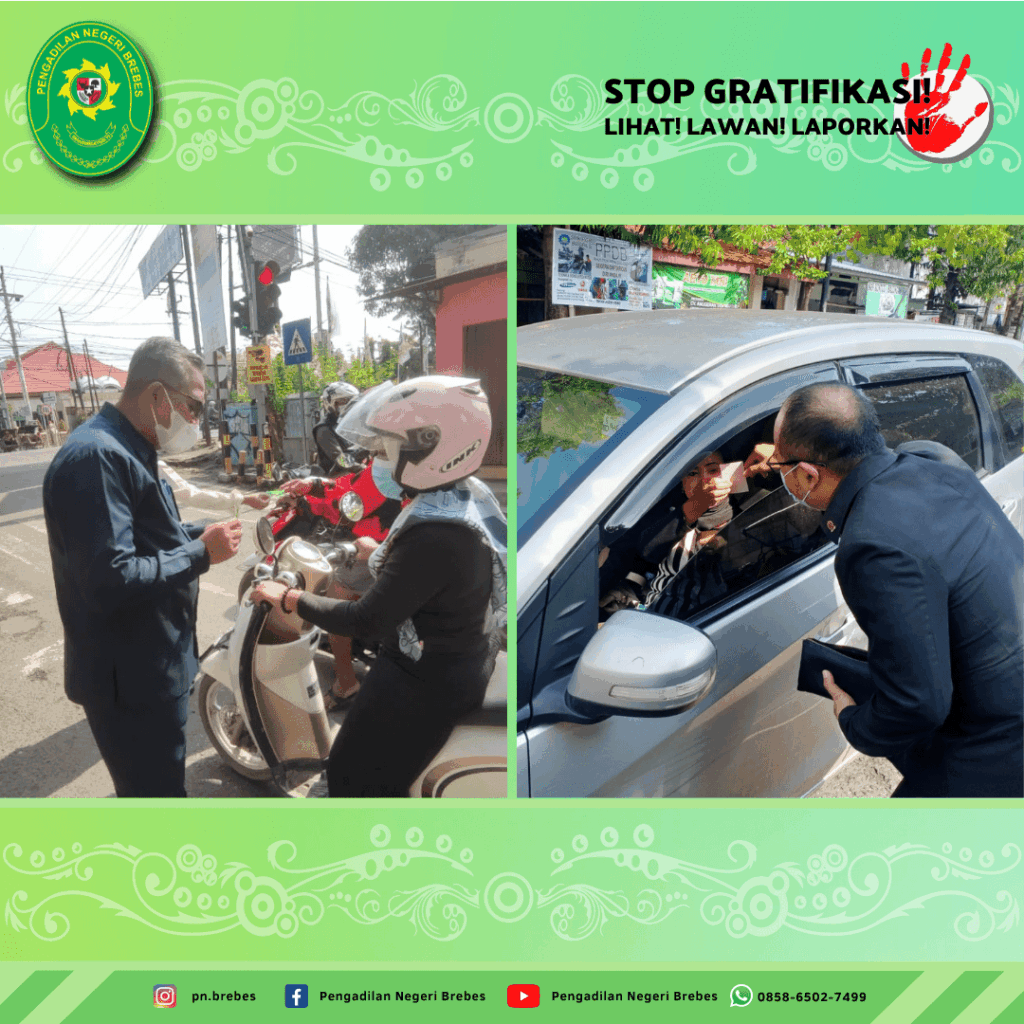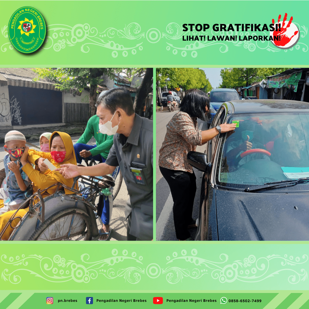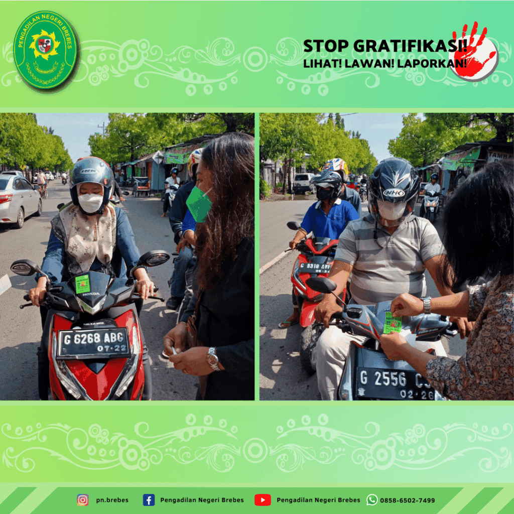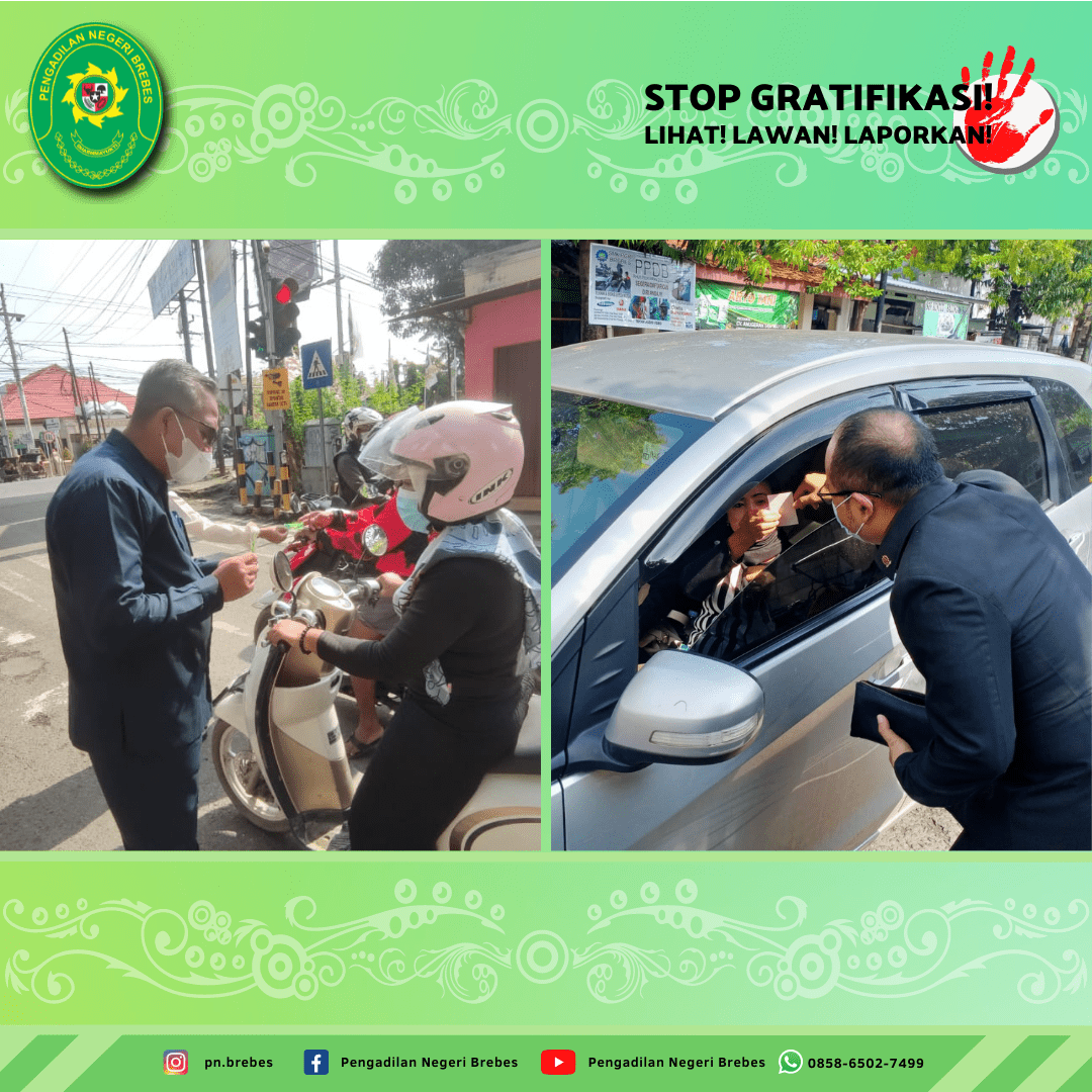 Pengadilan Negeri Brebes Kelas IB melaksanakan Kegiatan Kampanye Tolak Gratifikasi dalam mendukung Pembangunan Zona Integritas WBK (Wilayah Bebas Korupsi) dan WBBM (Wilayah Birokrasi Bersih Melayani) pada Pengadilan Negeri Brebes. Pada kegiatan ini Pengadilan Negeri Brebes menyampaikan dalam memberikan pelayanan, harus Bersih dari Korupsi, Kolusi dan Nepotisme (KKN).