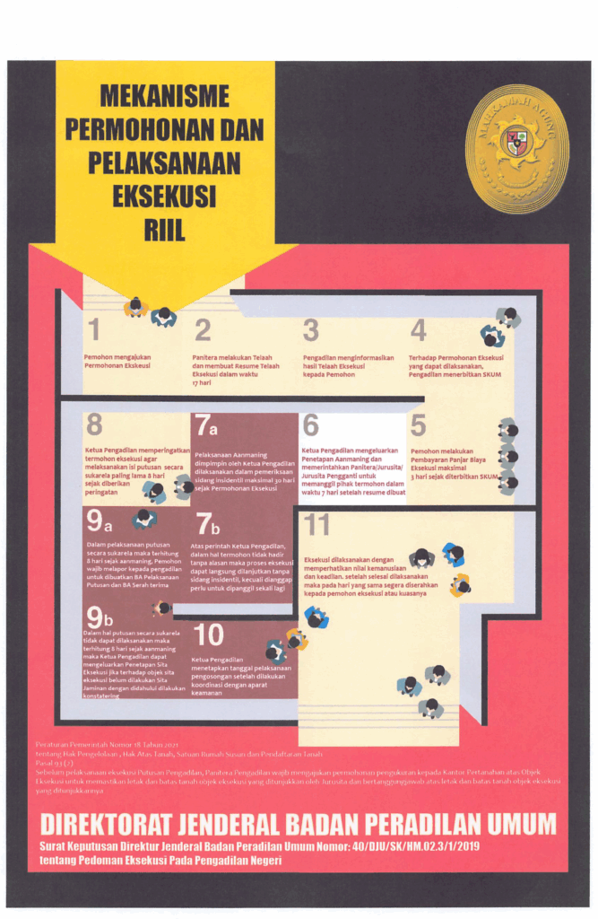 Berikut ini adalah Mekanisme Permohonan Dan Pelaksanaan Eksekusi Riil sesuai dengan Surat Keputusan Direktur Jenderal Badan Peradilan Umum Nomor 40/DJU/SK/HM.02.3/1/2019 tentang Pedoman Eksekusi Pada Pengadilan Negeri