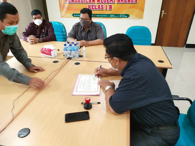 (Brebes, 12 Januari 2021) Bertempat di Ruang Rapat yang dihadiri oleh Ketua Pengadilan Negei Brebes yaitu Bpk. Tornado Edmawan, S.H.,M.H, Panitera Bpk. Sutikno, SH, Panitera Muda Hukum Bpk. Sutriono, SH Serta Ketua LBH Perisai Kebenaran Cabang Brebes Bpk. Ahmad Torikhin, SH Melakukan MoU (Memorandum of Understanding) antara Pengadilan Negeri Brebes Kelas IB dan Lembaga Bantuan Hukum Cabang Brebes. Ketua PN Brebes menyampaikan pesan agar meningkatkan kinerja dari tahun lalu dan memperbaiki apa yang harus dibenahi agar semakin lebih baik ke depannya. Panitera PN Brebes memberi masukkan agar semua yang sudah disepakati dalam Perjanjian agar ditaati, menjaga nama baik Pengadilan dan Menjaga Kebersihan POSBAKUM (Pos Bantuan Hukum).