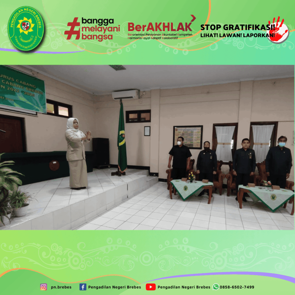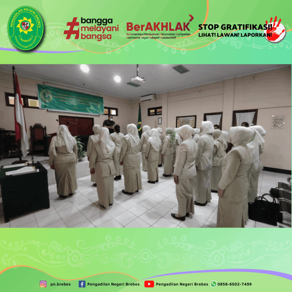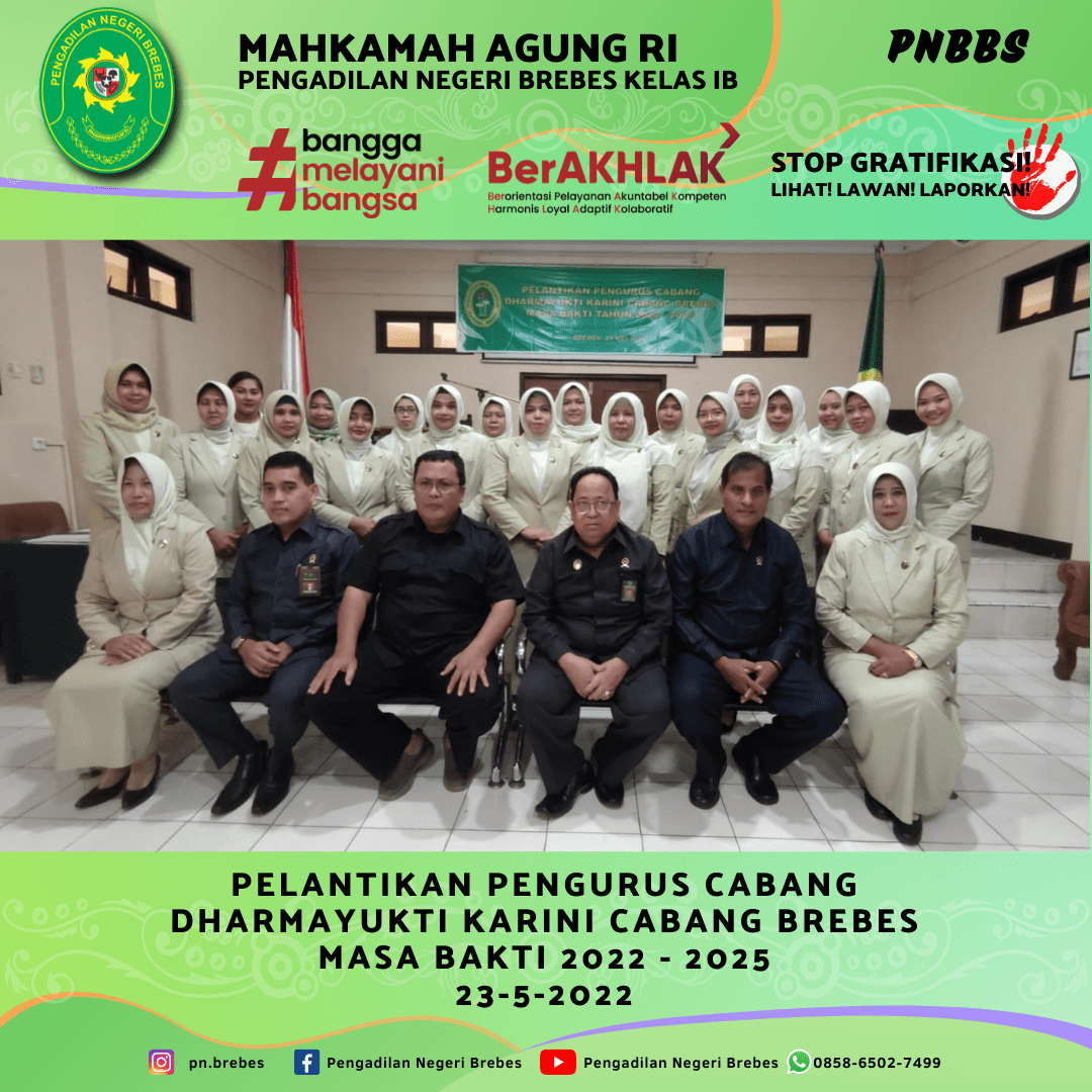 Dharmayukti Karini Cabang Brebes melaksanakan Kegiatan Pelantikan Pengurus Cabang Dharmayukti Karini Cabang Brebes Masa Bakti 2022 – 2025 bertempat di Ruang Sidang Candra Pengadilan Negeri Brebes. Kegiatan tersebut dibuka dengan menyanyikan lagu kebangsaan Indonesia Raya, Hymne dan Mars Dharmayukti Karini.