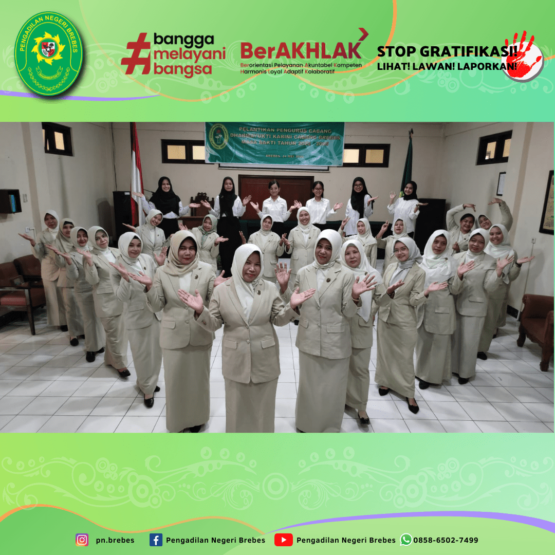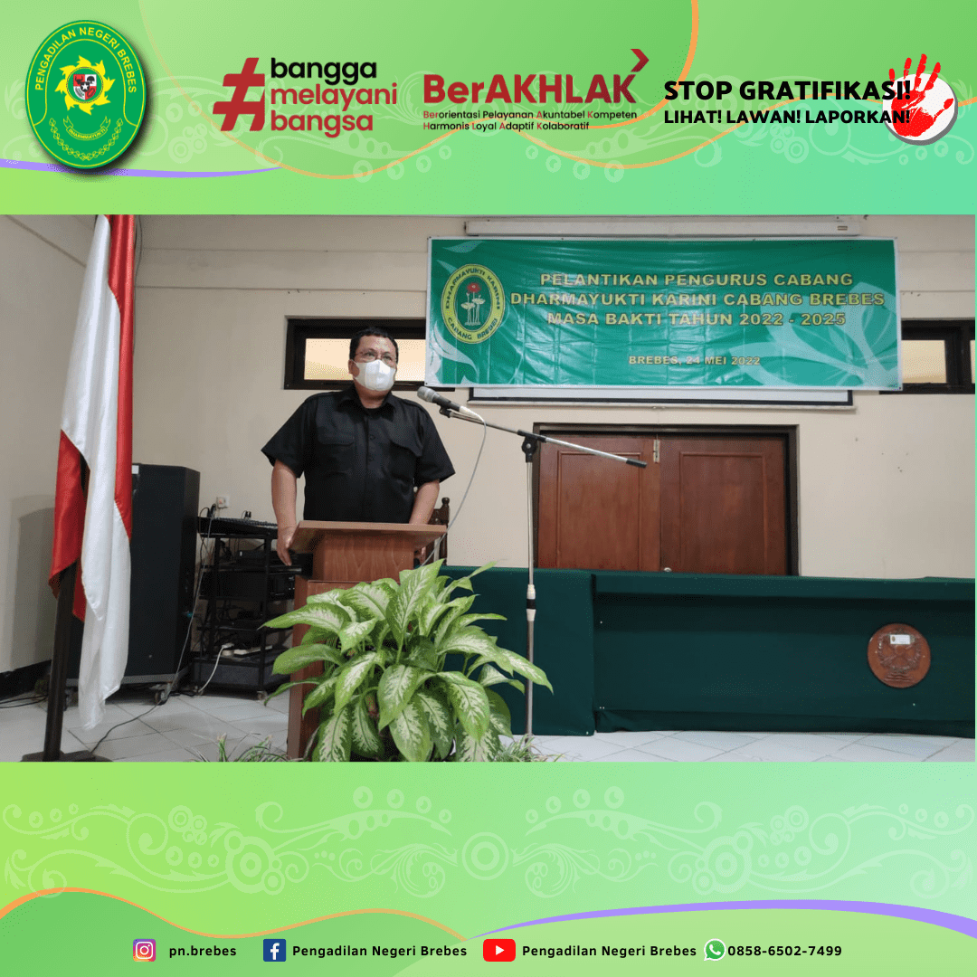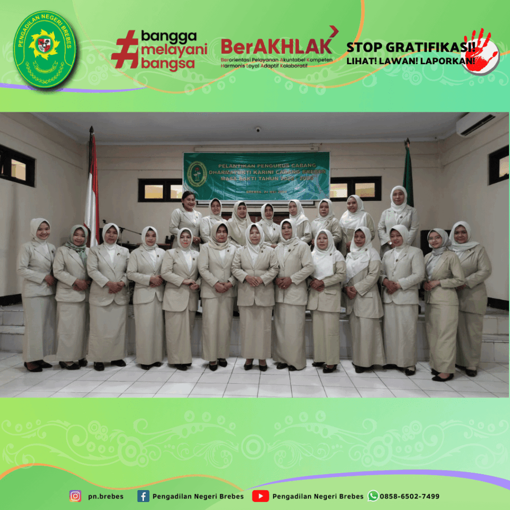 Dharmayukti Karini Cabang Brebes melaksanakan Kegiatan Pelantikan Pengurus Cabang Dharmayukti Karini Cabang Brebes Masa Bakti 2022 – 2025 bertempat di Ruang Sidang Candra Pengadilan Negeri Brebes. Kegiatan tersebut dibuka dengan menyanyikan lagu kebangsaan Indonesia Raya, Hymne dan Mars Dharmayukti Karini.