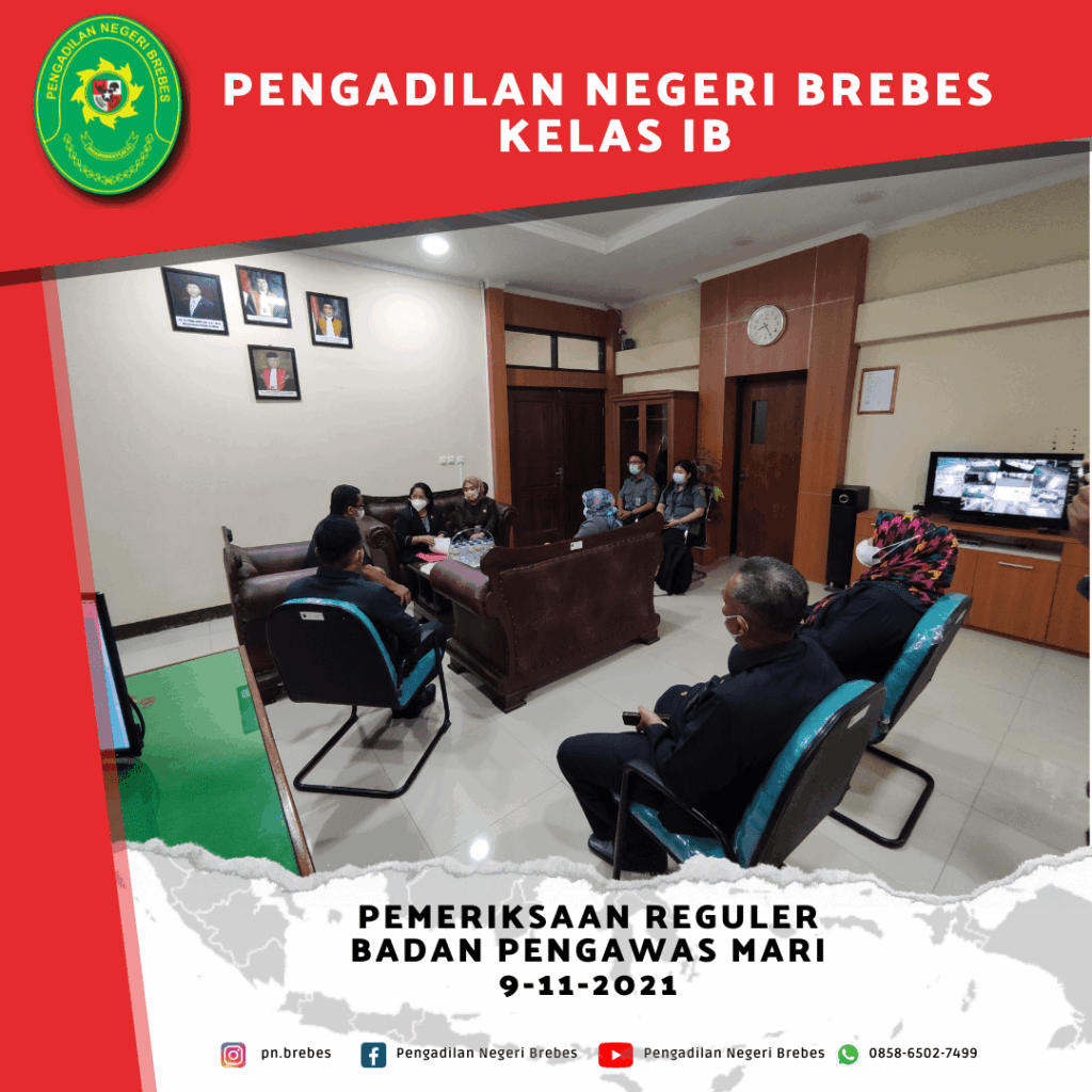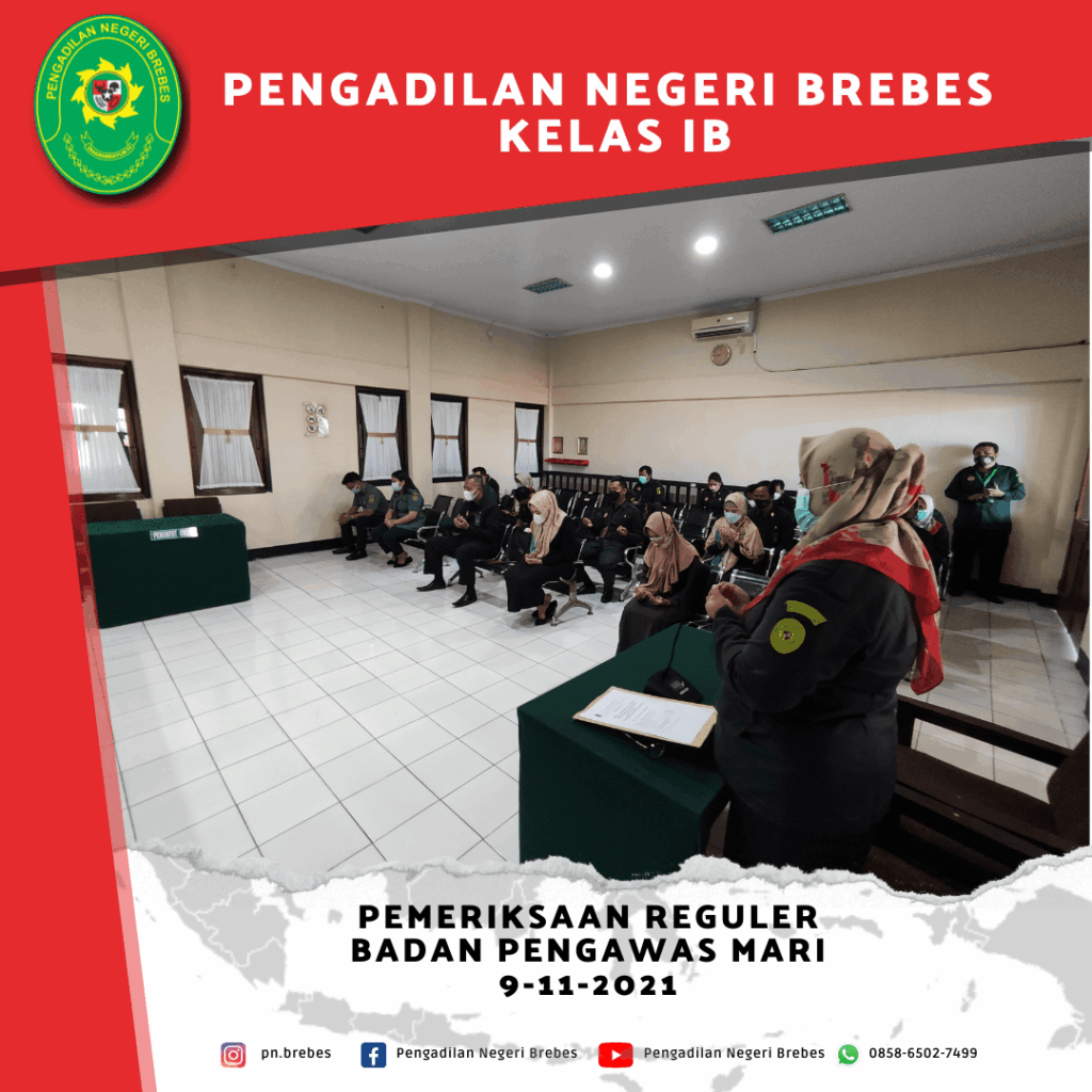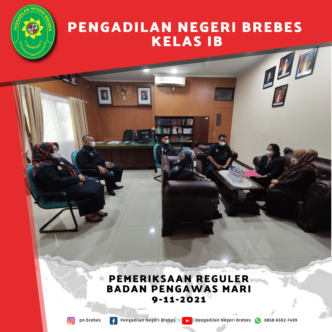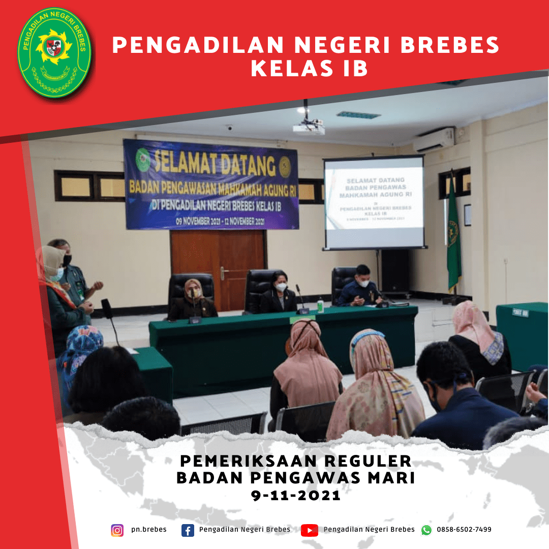 Pengadilan Negeri Brebes Kelas I.B menyambut kedatangan Tim Pemeriksa dari Badan Pengawasan Mahkamah Agung Republik Indonesia yang akan melaksanakan pemeriksaan rutin/reguler terkait manajemen peradilan kinerja pelayanan publik, administrasi persidangan, administrasi perkara dan administrasi umum sejak hari Selasa, 9 November 2021 sampai dengan hari Jum’at, 12 November 2021.
