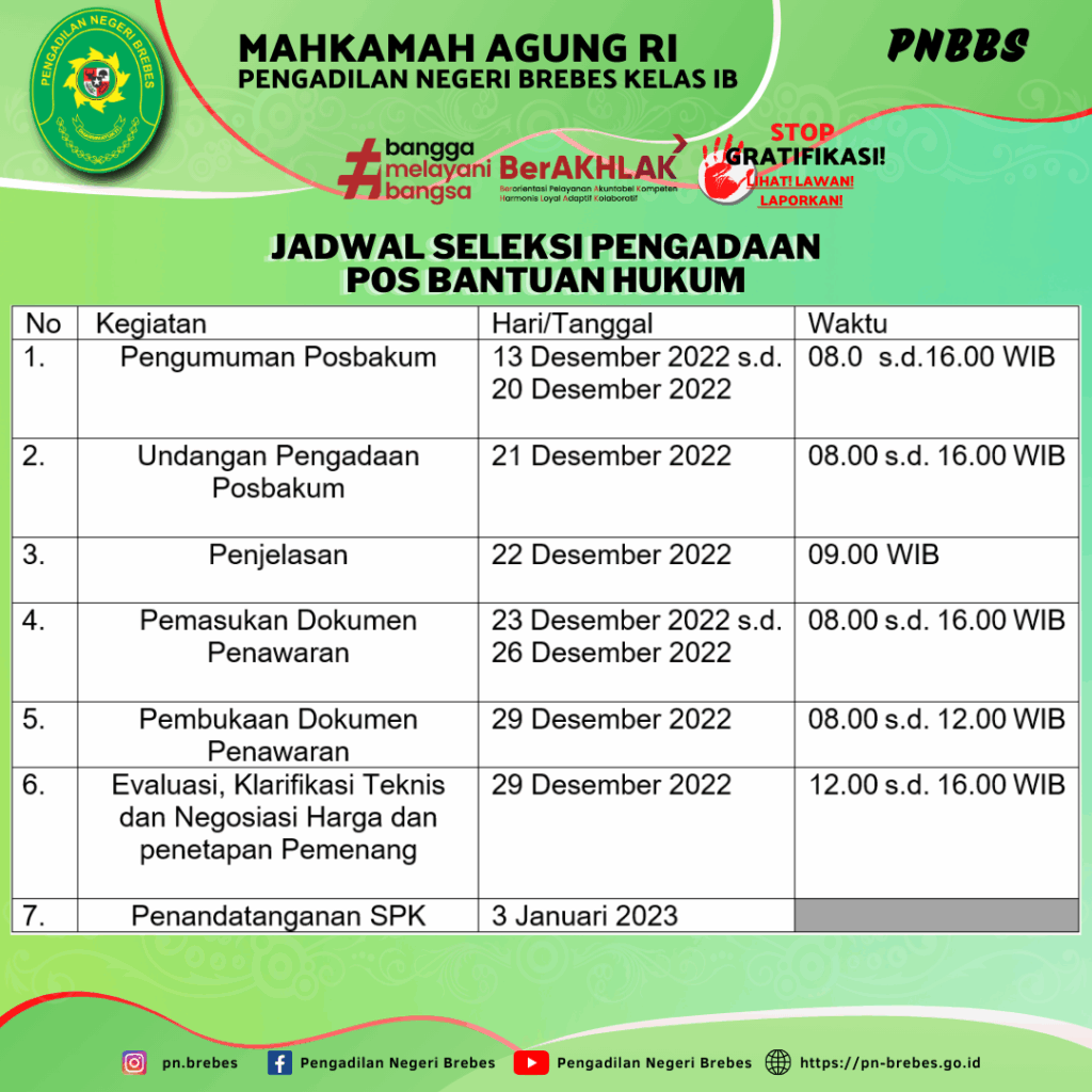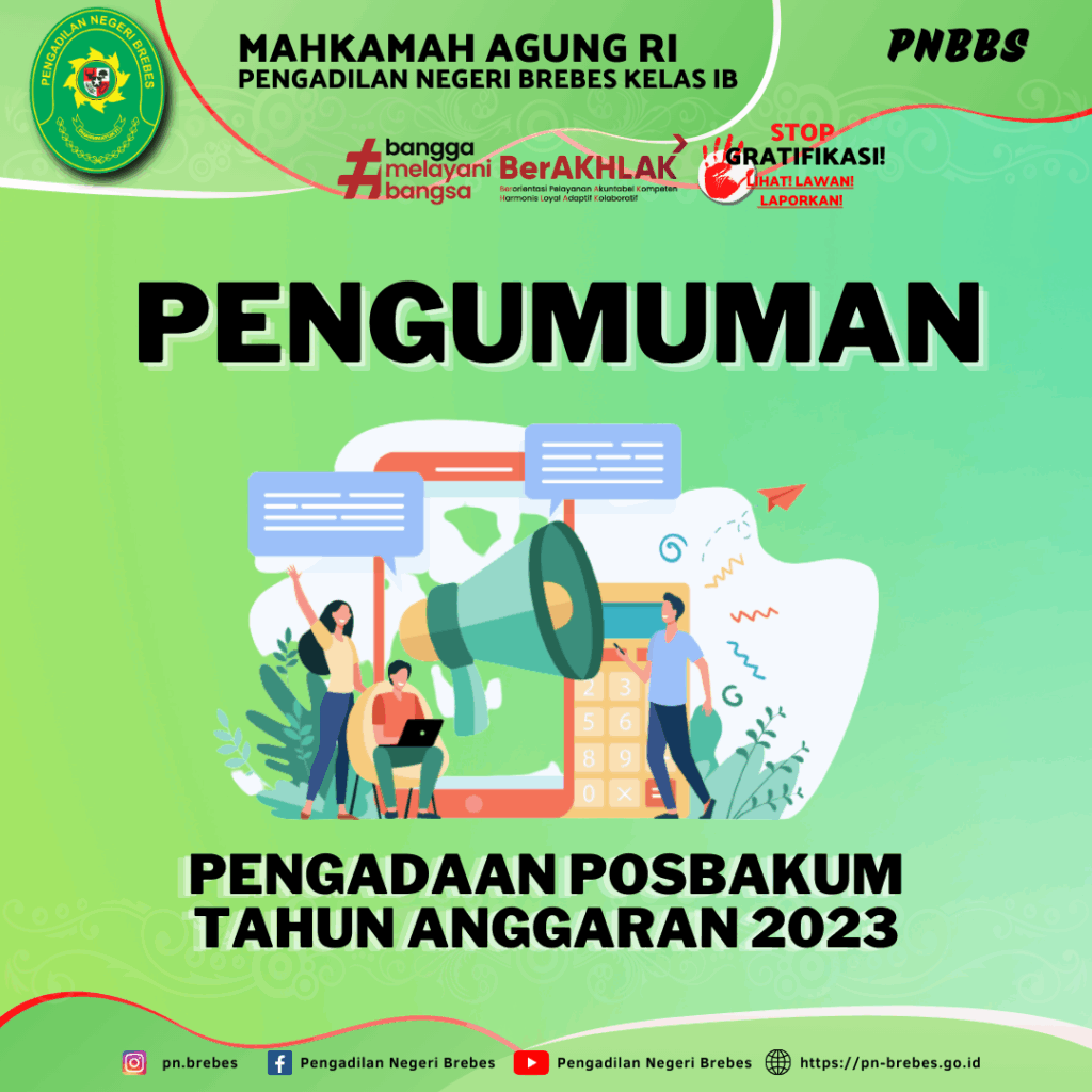 PENGUMUMAN. Pengadilan Negeri Brebes Kelas IB melaksanakan Pengadaan Pos Bantuan Hukum (POSBAKUM) untuk Tahun 2023. Untuk persyaratan dapat dilihat langsung