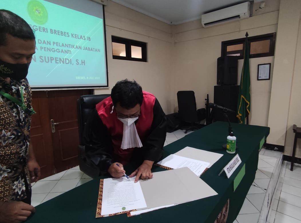 Brebes, 8 Juli 2021 | Pengadilan Negeri Brebes melaksanakan kegiatan Pengambilan Sumpah dan Pelantikan Jabatan Panitera Pengganti Bpk. Epen Supendi S.H. yang dipimpin langsung oleh Bpk. Tornado Edmawan S.H., M.H., selaku Ketua Pengadilan Negeri Brebes dan dihadiri secara terbatas.