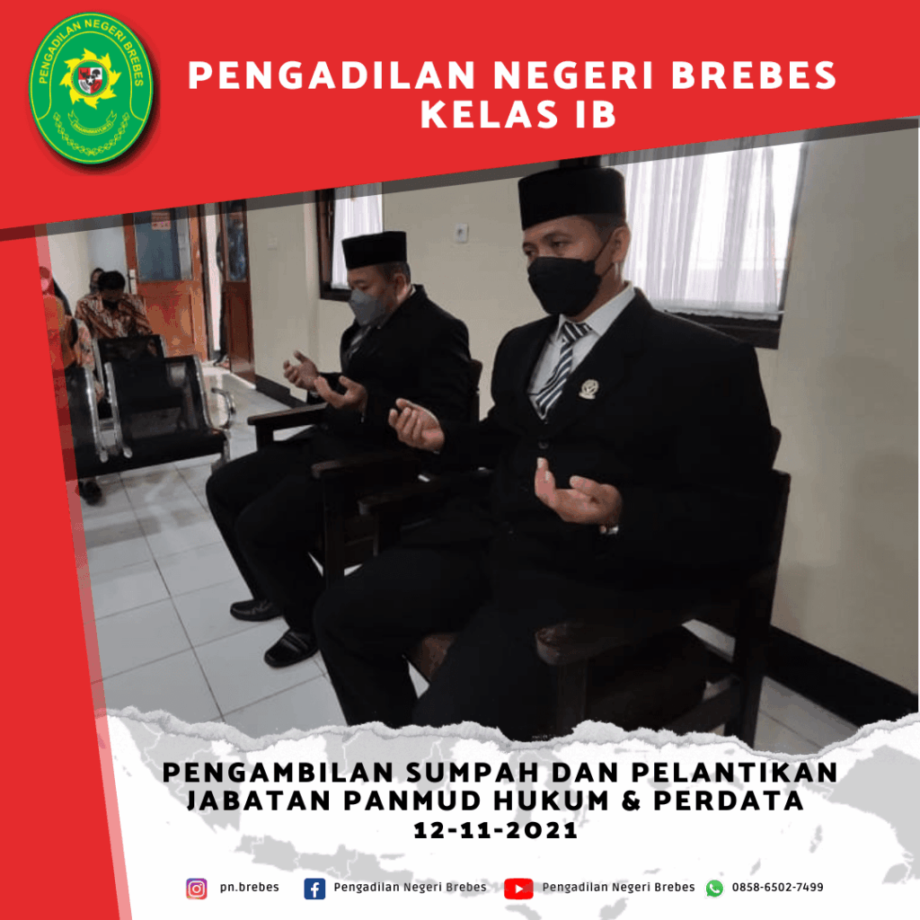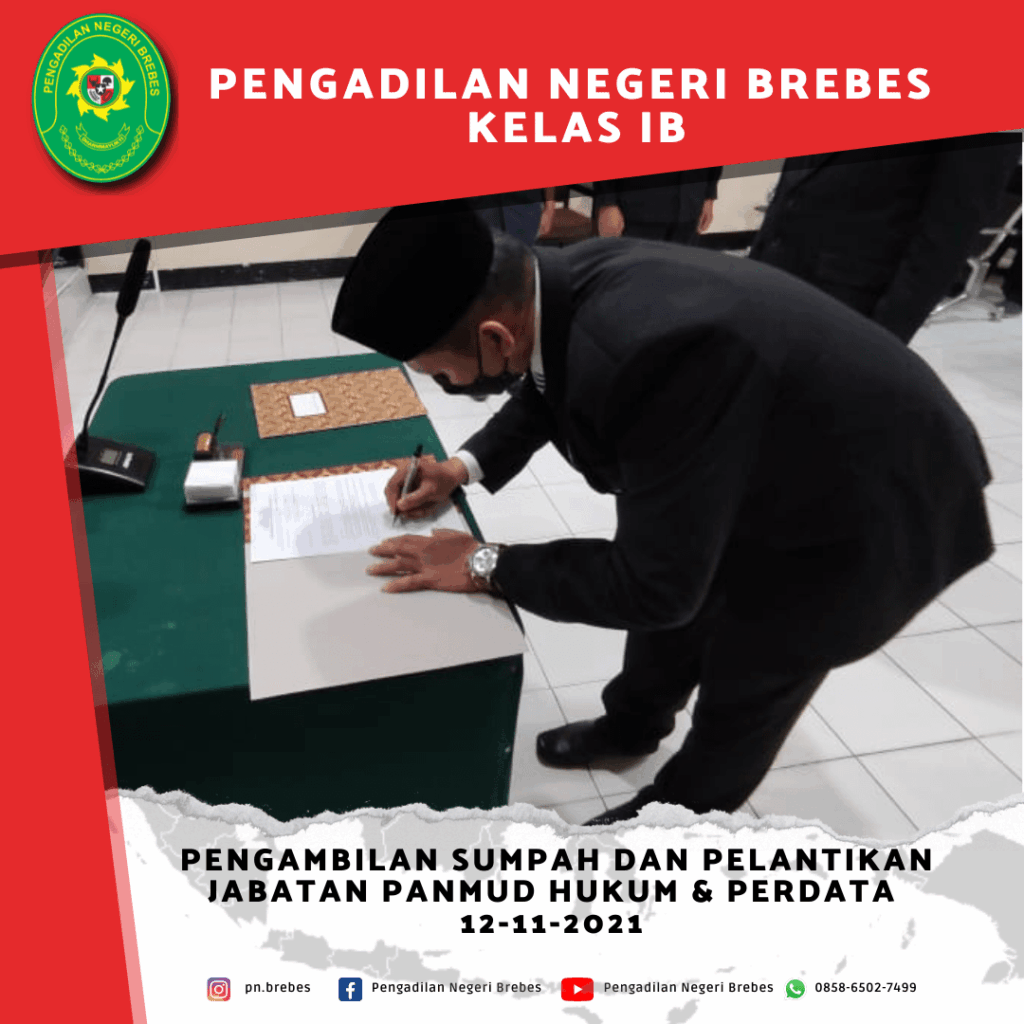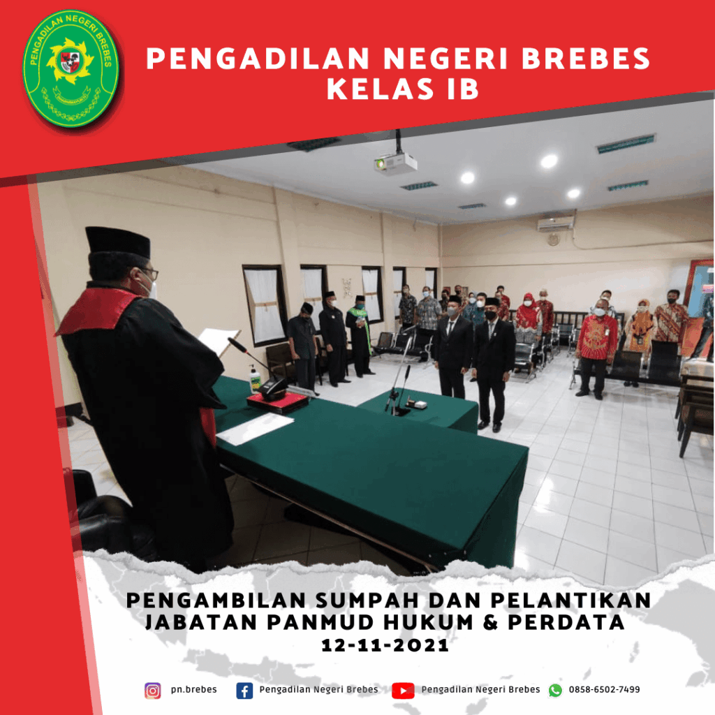 Kegiatan pelantikan tersebut dipimpin oleh Ketua Pengadilan Negeri Brebes Bapak Tornado Edmawan, S.H., M.H., dan dihadiri terbatas oleh beberapa Hakim, Panitera, serta Pegawai lainnya dari Pengadilan Negeri Brebes dan Pengadilan Negeri Tegal.