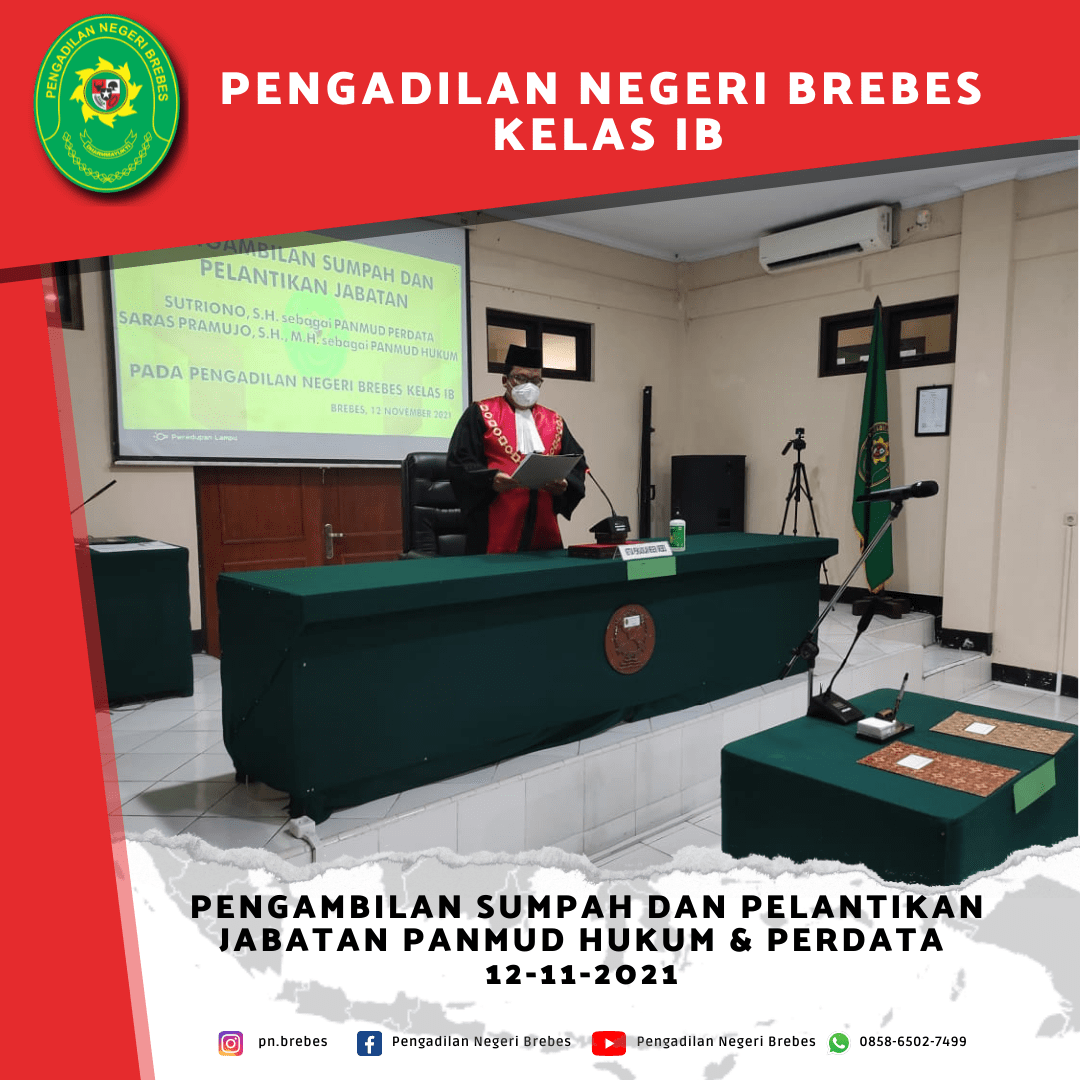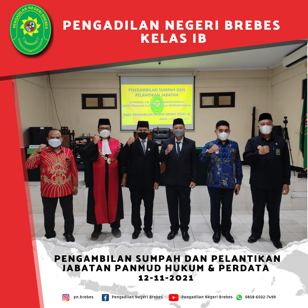 Kegiatan pelantikan tersebut dipimpin oleh Ketua Pengadilan Negeri Brebes Bapak Tornado Edmawan, S.H., M.H., dan dihadiri terbatas oleh beberapa Hakim, Panitera, serta Pegawai lainnya dari Pengadilan Negeri Brebes dan Pengadilan Negeri Tegal.