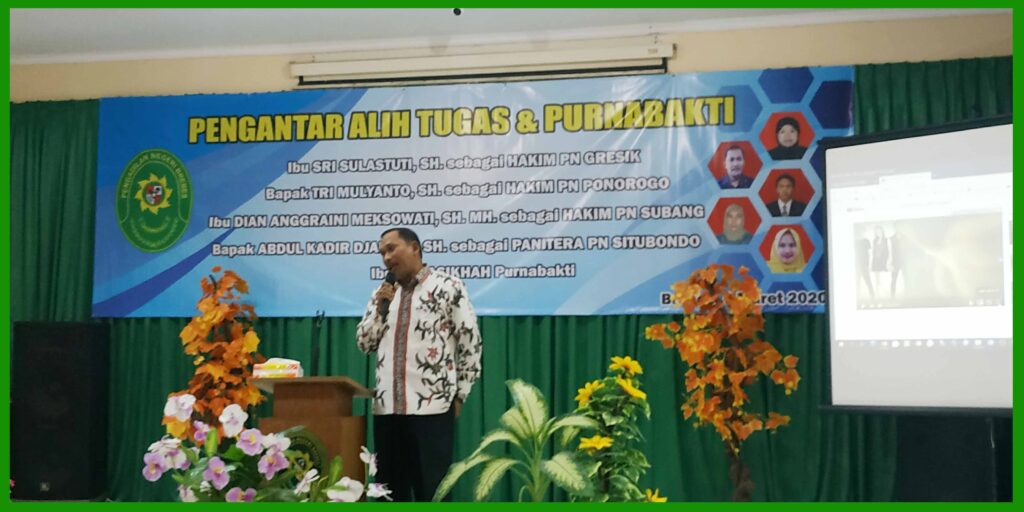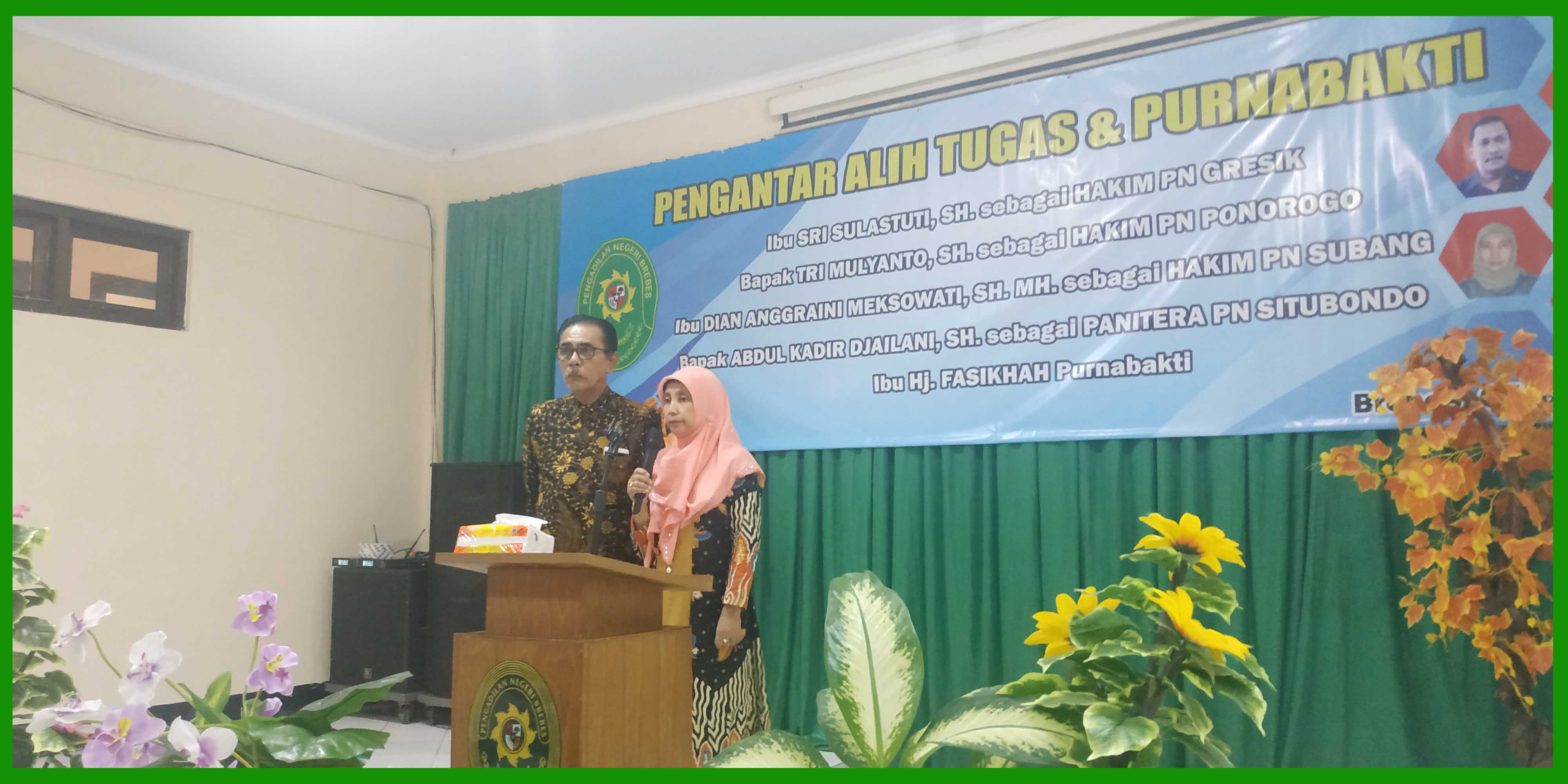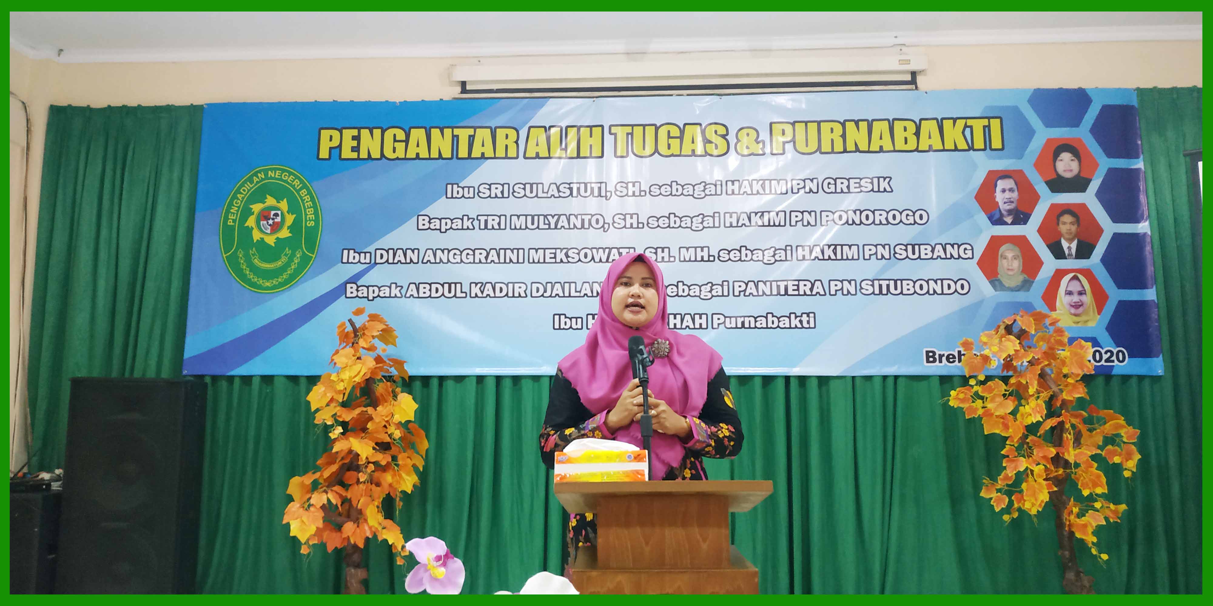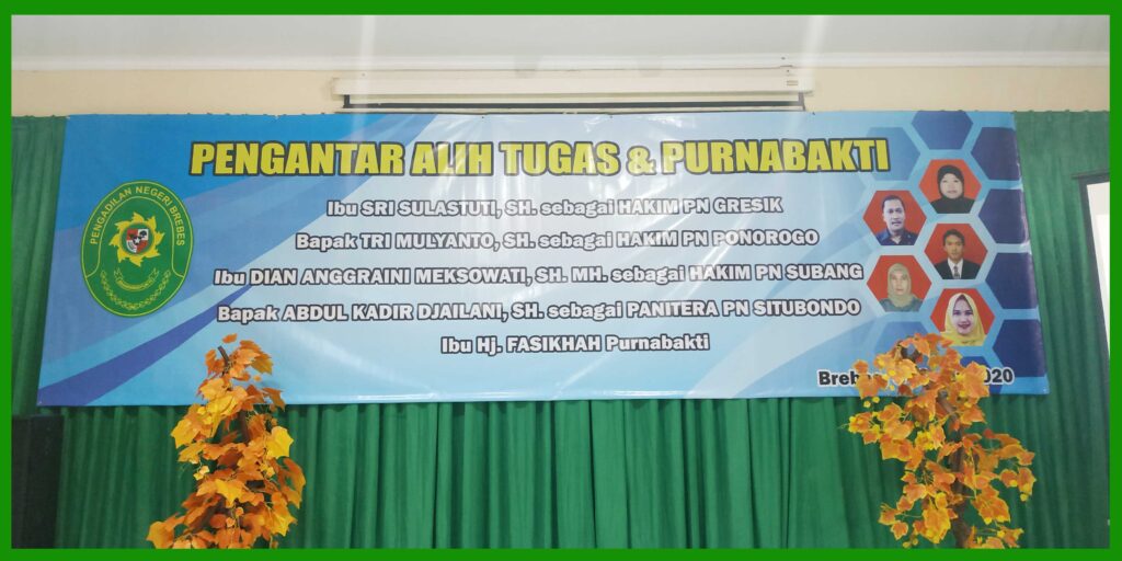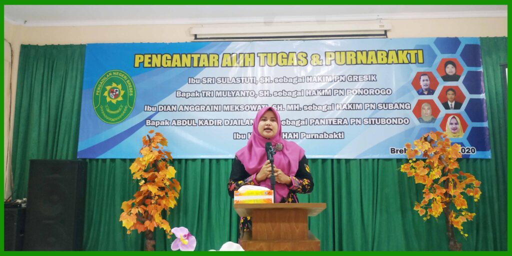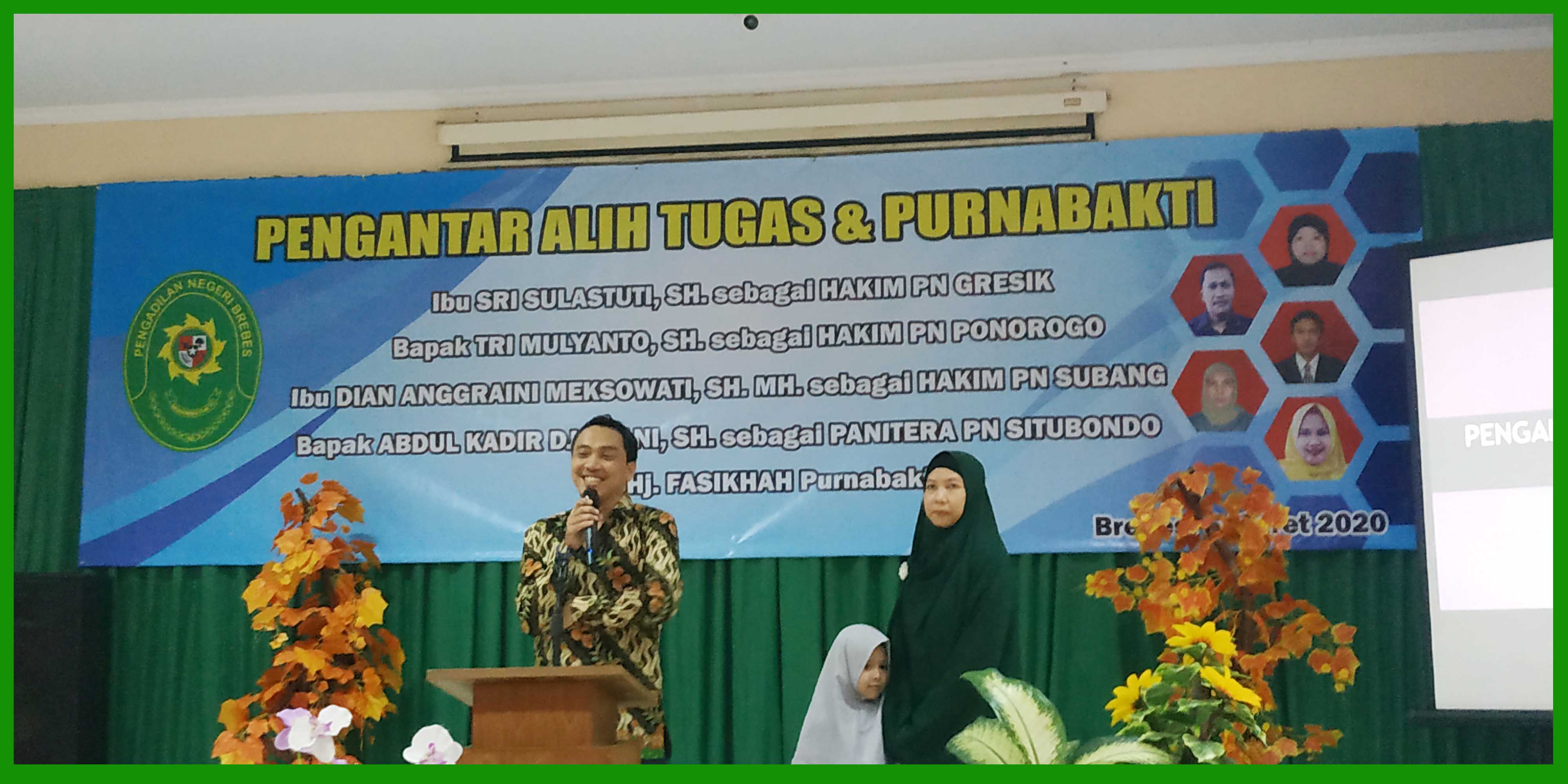(Brebes, 6 Maret 2020), Bertempat di Ruang Sidang Candra telah dilakukan acara Pengantar Alih Tugas dan Purna Bhakti bagi Hakim, Panitera dan Staff Pengadilan Negeri Brebes. Dalam acara tersebut dihadiri oleh Ketua Pengadilan Negeri Brebes Bpk. Edi Saputra Pelawi, SH. MH. dan seluruh pegawai. Hakim yang mendapat mutasi adalah Sri Sulastuti, SH. yang mutasi ke PN Gresik, Tri Mulyanto, SH. yang mutasi ke PN Ponorogo, Dian Anggraini Meksowati, SH MH. yang mutasi ke PN Subang. Sedangkan Panitera Abdul Kadir Djailani, SH. yang mutasi ke PN Situbondo. Dan Staff yang purna bhakti yaitu Hj. Fasikhah.