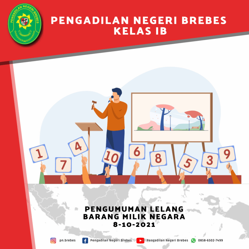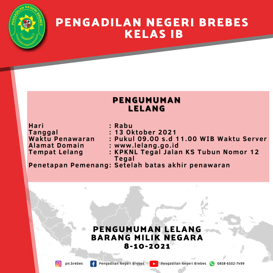Berdasarkan surat dari Kantor Pelayanan Kekayaan Negara dan Lelang (KPKNL) Tegal Nomor : S-999/WKN.09/KNL.05/2021 tanggal 06 Oktober 2021 tentang Penetapan Jadwal Lelang, dengan ini diumumkan bahwa Pengadilan Negeri Brebes melalui KPKNL Tegal akan melaksanakan Lelang melalui internet (Open Bidding) berupa :