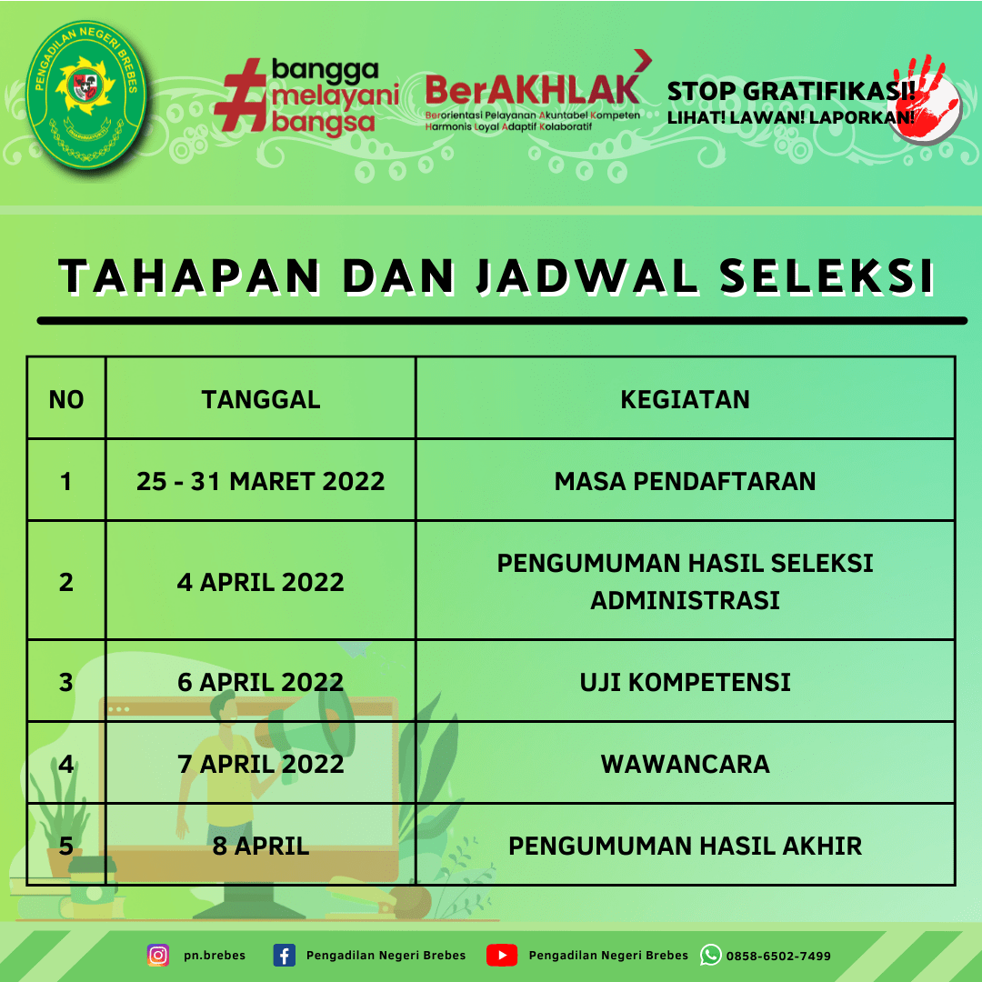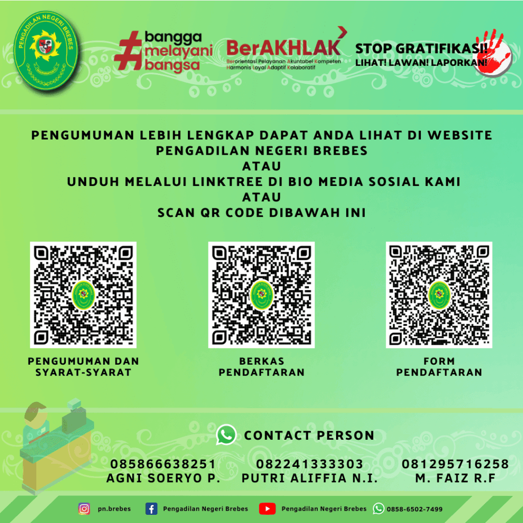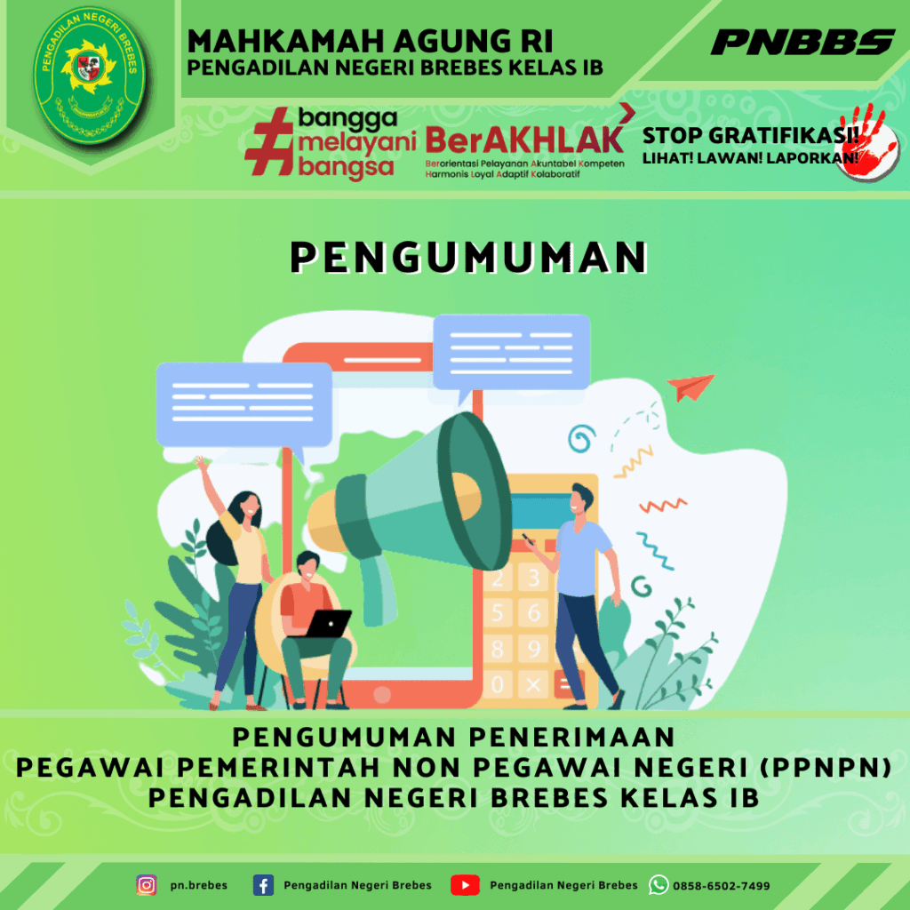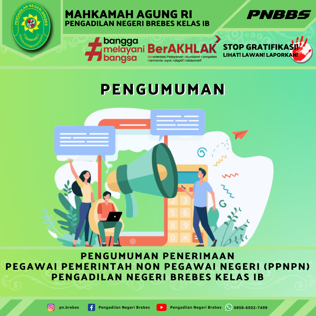Pengadilan Negeri Brebes Kelas I B dengan ini membuka kesempatan kepada Warga Negara Indonesia yang memiliki dedikasi, integritas, kompetensi dan komitmen yang tinggi untuk menjadi Pegawai Pemerintah Non Pegawai Negeri (PPNPN) yang ditugaskan pada Pengadilan Negeri Brebes Kelas I B.