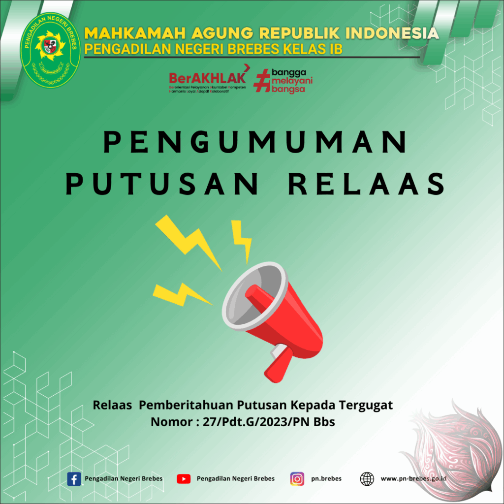 Pengumuman Pemberitahuan Relaas Putusan Kepada Tergugat Nomor : Nomor : 27/Pdt.G/2023/PN Bbs info lebih lanjut dapat anda lihat dan download