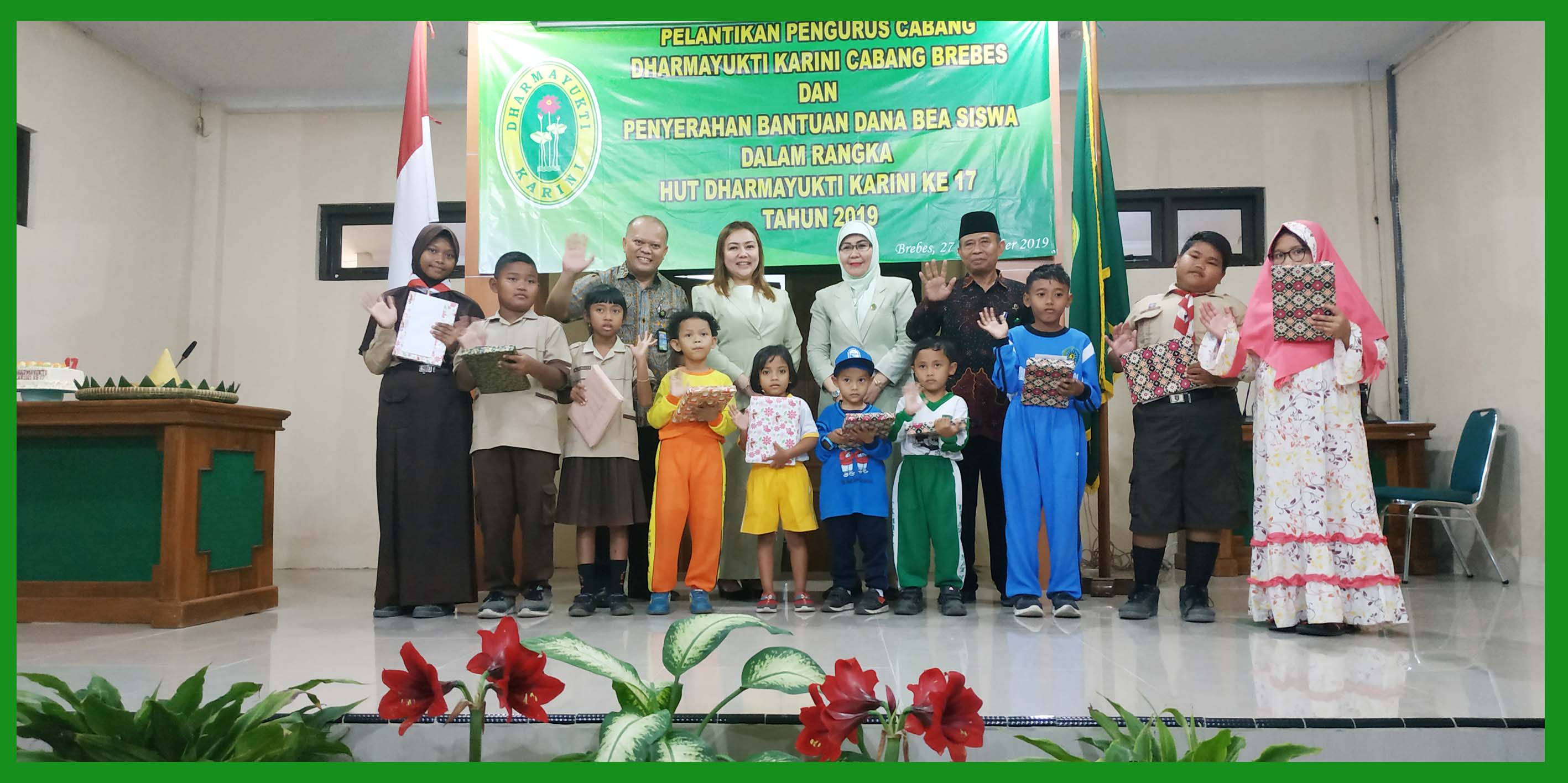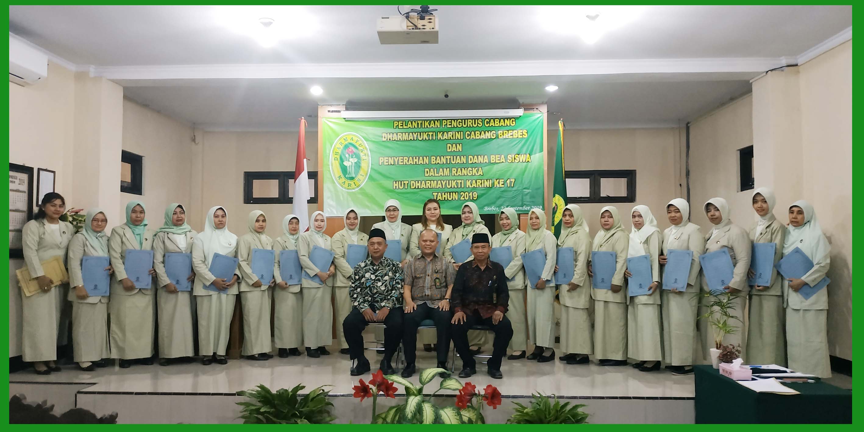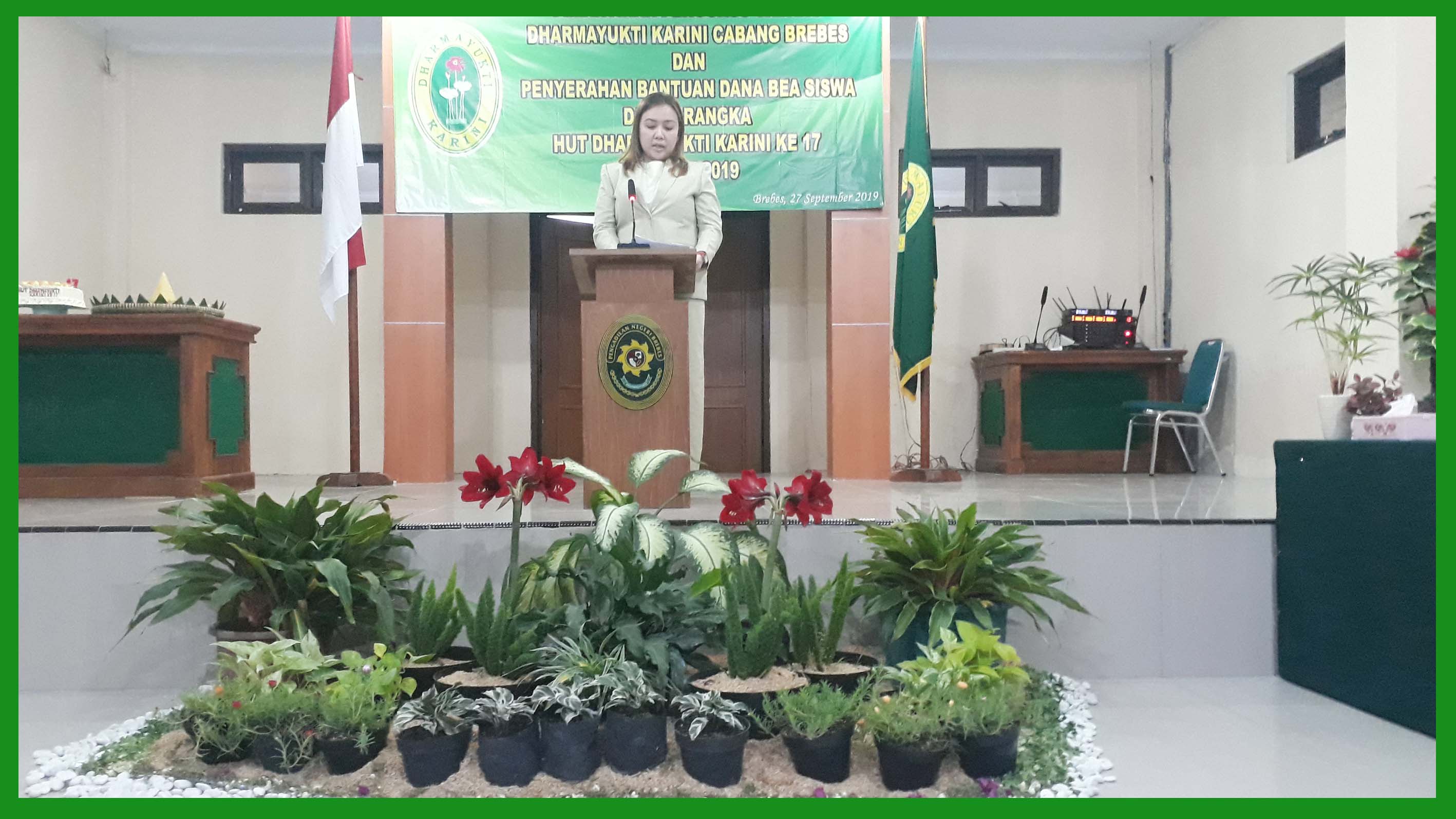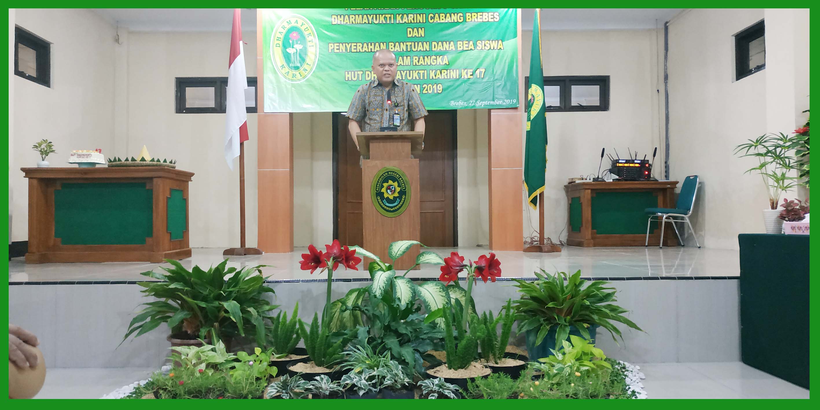 Brebes, 27 September 2019 – Peringatan HUT Dharmayukti ke 17 Tahun 2019 di Pengadilan Negeri Brebes diisi dengan kegiatan pelantikan pengurus cabang dharmayukti karini cabang brebes dan penyerahan bantuan dana bea siswa terhadap anak-anak pegawai di Pengadilan Negeri Brebes dan Pengadilan Agama Brebes. Dalam kegiatan ini dihadiri oleh Bpk. Edi Saputra Pelawi , SH.MH selaku Ketua Pengadilan Negeri Brebes dan Bpk. Drs. H. Abdul Basyir, M.Ag selaku Ketua Pengadilan Agama Brebes.