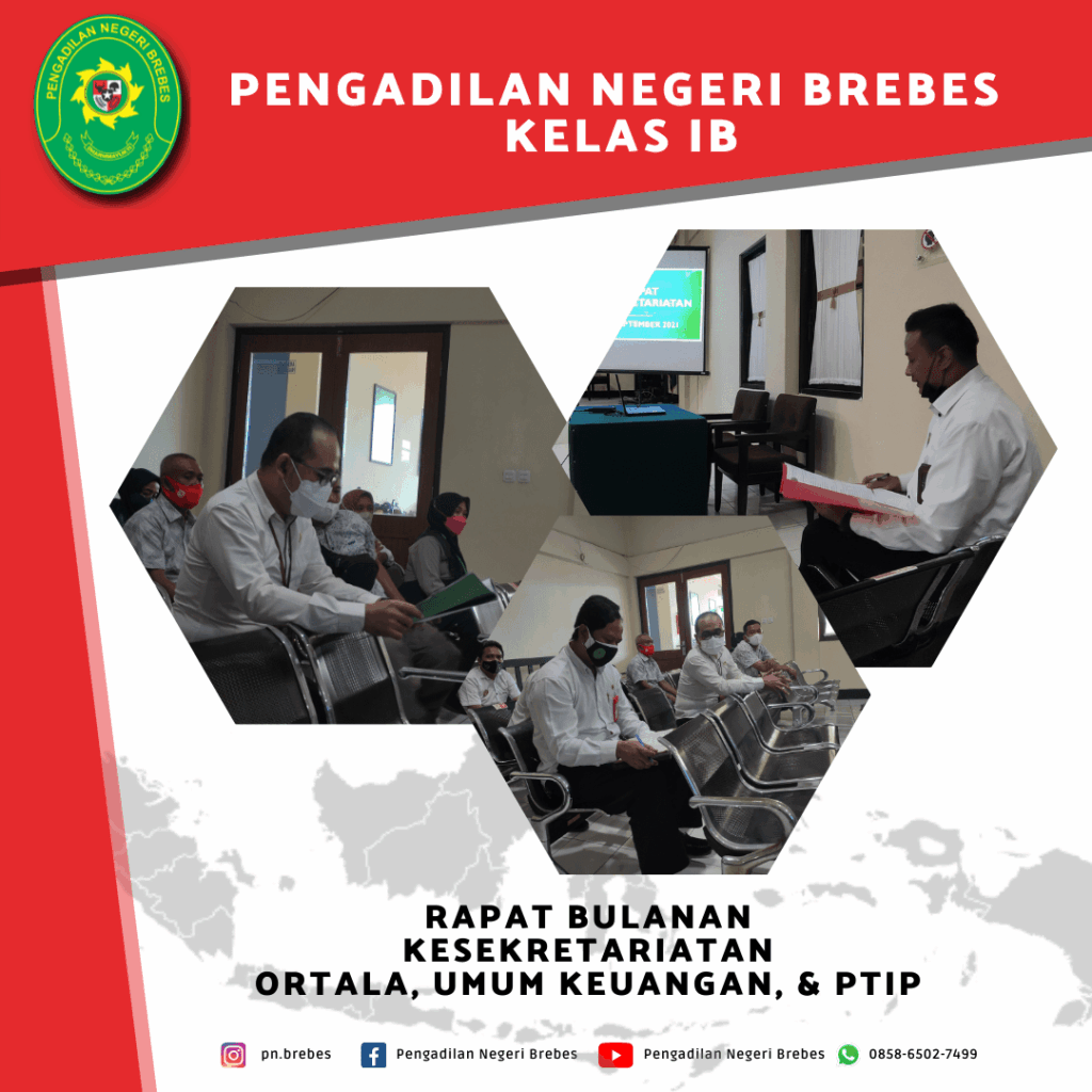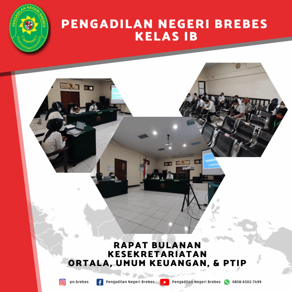 Pengadilan Negeri Brebes Kelas IB melaksanakan kegiatan Rapat Bulanan yang merupakan Rapat Berjenjang Bagian Kesekretariatan Umum Keuangan, Ortala, dan PTIP. Rapat tersebut dipimpin langsung oleh Sekretaris Pengadilan Negeri Brebes Ibu RR Sarsanti Kartika Dewi, S.H., dan Wakil Ketua Pengadilan Negeri Brebes Bapak Dr. Dedy Muchti Nugroho, S.H., M.Hum. selaku Koordinator Pengawas.