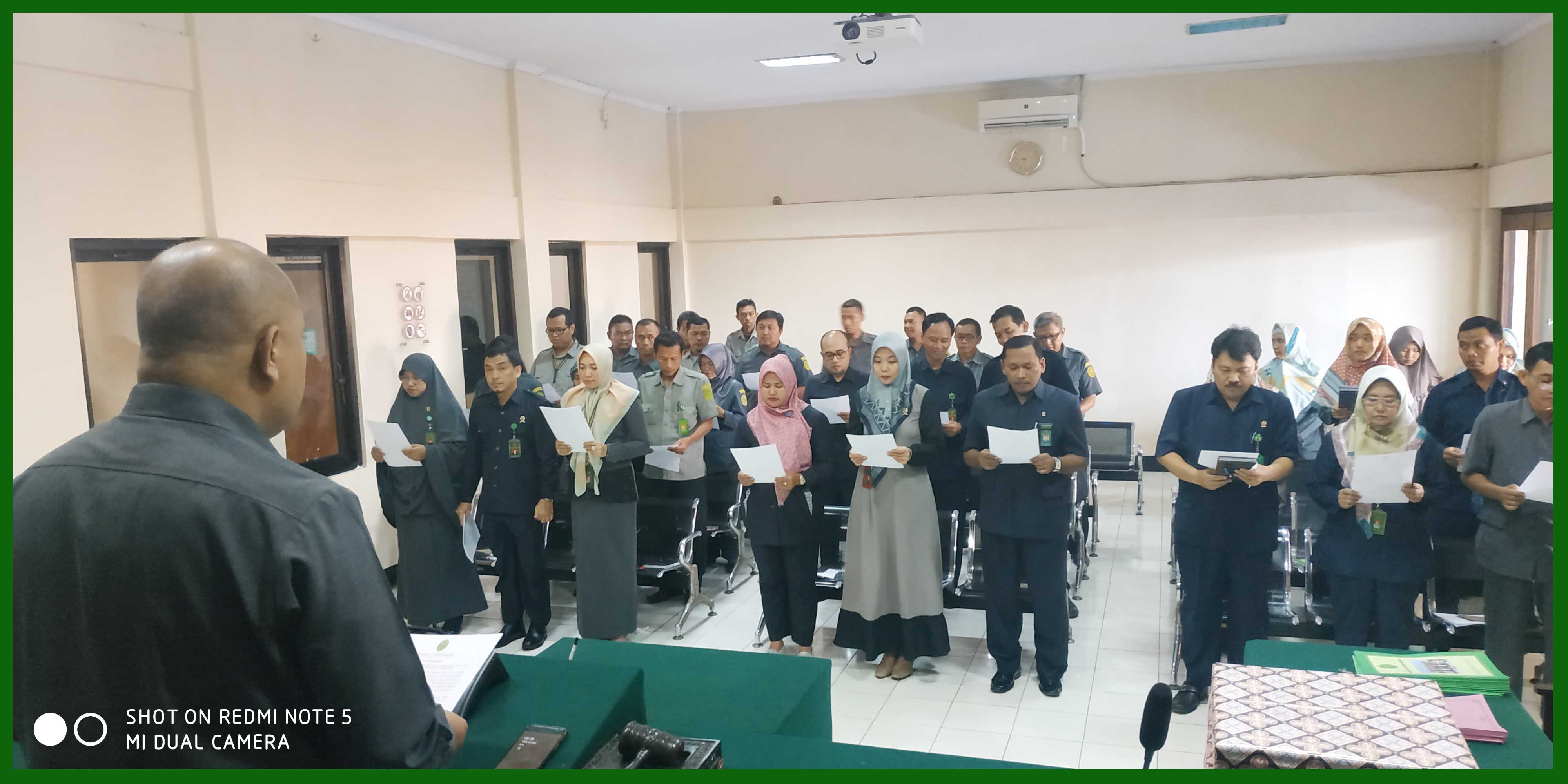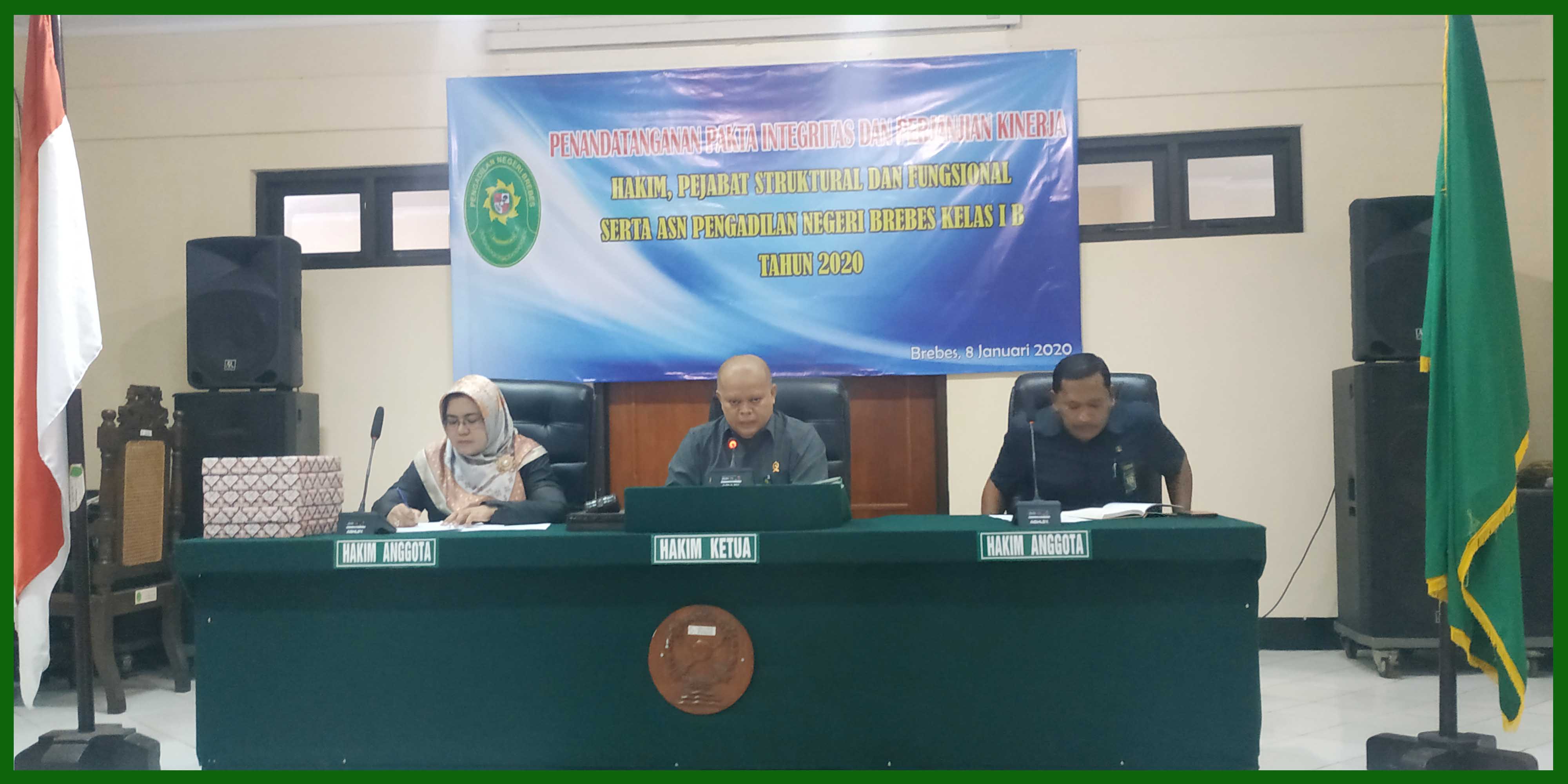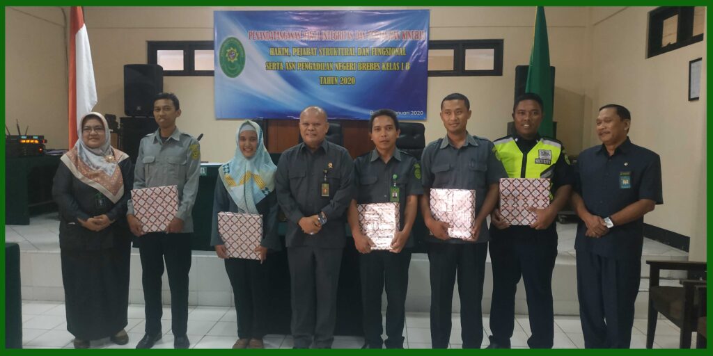 (Brebes, 08 Januari 2020) Bertempat di ruang sidang Candra Pengadilan Negeri Brebes, segenap Hakim, Pejabat struktural, Panitera Pengganti, Karyawan/Karyawati, dan Honorer menghadiri rapat rutin bulanan di bulan Januari 2020. Dalam rapat tersebut dipimpin oleh Ketua Pengadilan Negeri Brebes Bpk. Edi Saputra Pelawi, SH,.MH. yang didampingi oleh Panitera Pengadilan Negeri Brebes Bpk. Abdul Kadir Djailani, SH. dan Sekretaris Pengadilan Negeri Brebes Ibu Rr. Sarsanti Kartika Dewi, SH. Rapat diawali dengan Menyanyikan Lagu Indonesia Raya dan Hymne Mahkamah Agung RI. Pada rapat tersebut juga diadakan penandatanganan pakta integritas dan perjanjian kinerja Hakim, Pejabat Struktural dan Fungsional serta ASN Pengadilan Negeri Brebes Kelas IB. Serta juga diadakan pemberian penghargaan terhadap honorer terbaik di Pengadilan Negeri Brebes Kelas IB.