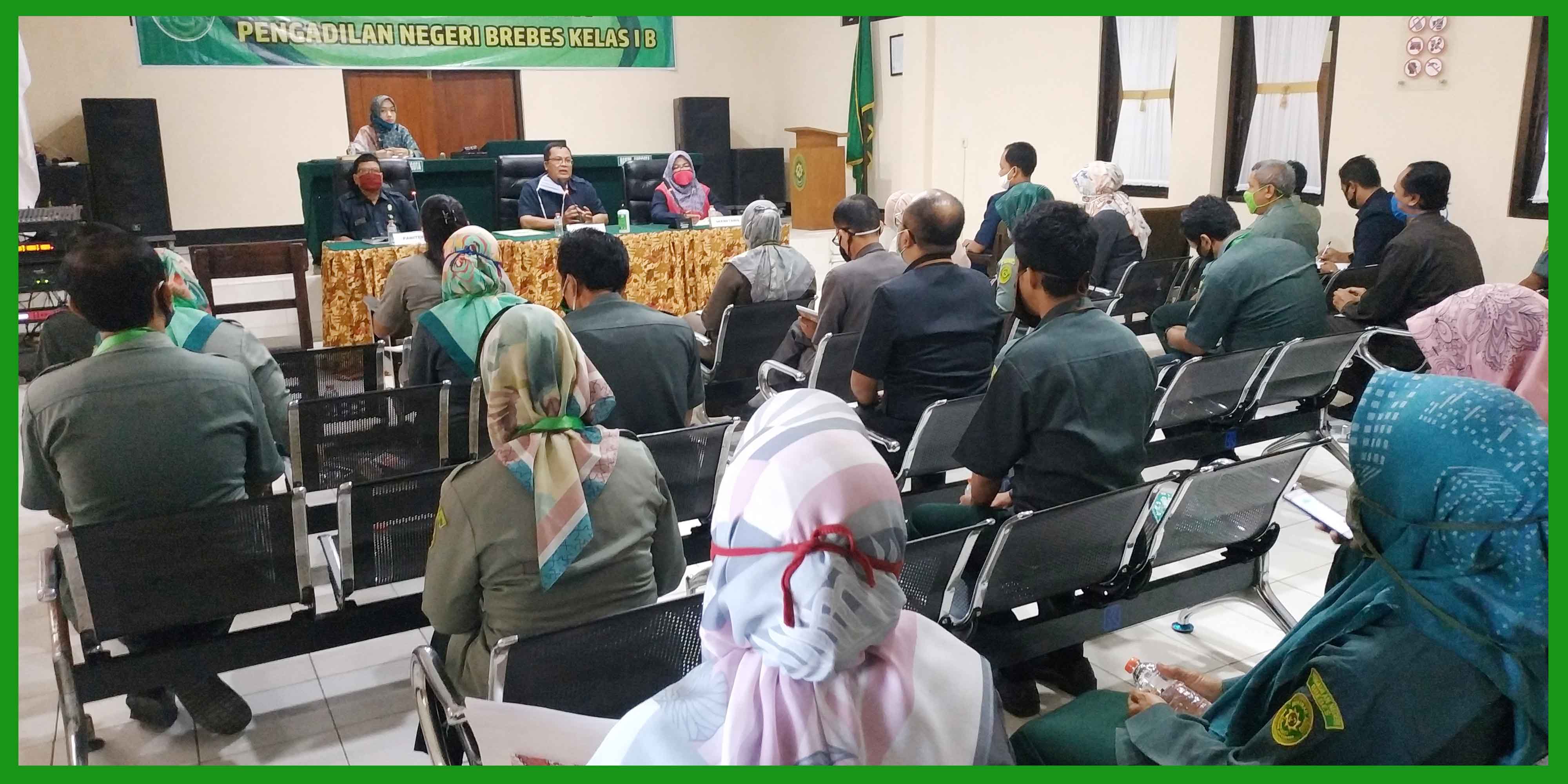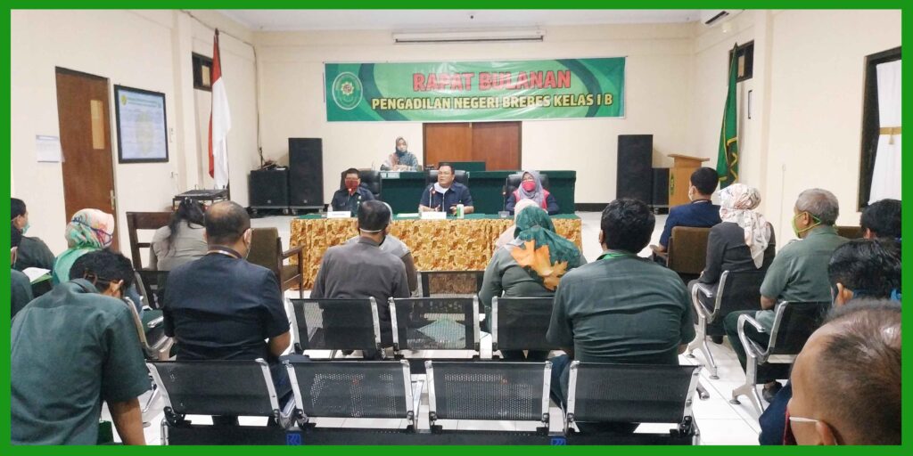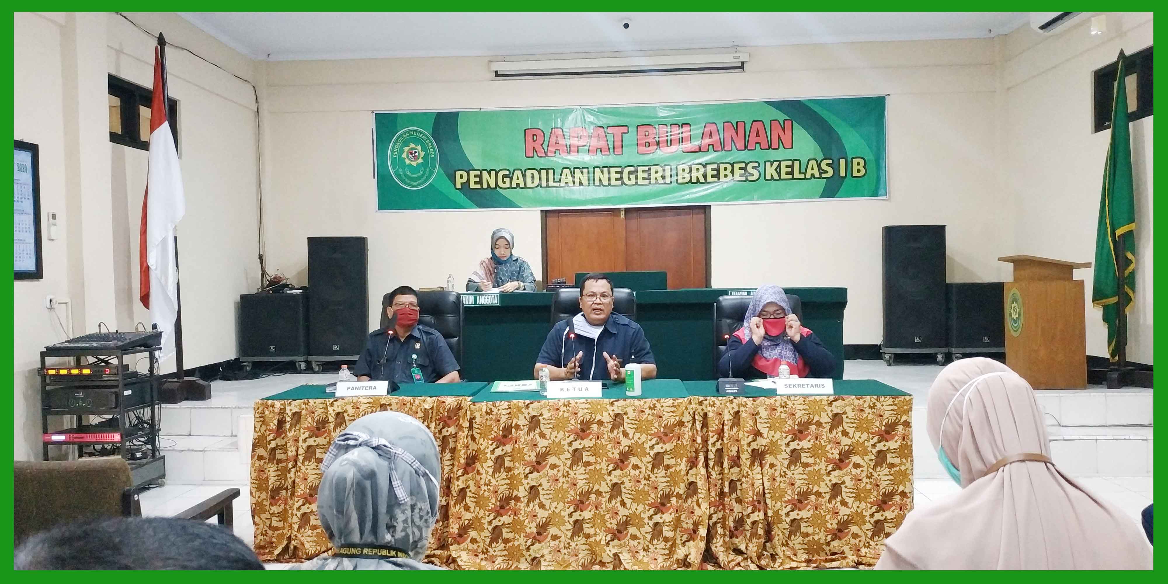 (Brebes, 13 Juli 2020) Bertempat di ruang sidang Candra Pengadilan Negeri Brebes, segenap Hakim, Pejabat struktural, Panitera Pengganti, Karyawan/Karyawati, dan Honorer menghadiri rapat rutin bulanan di bulan Juli 2020. Dalam rapat tersebut dipimpin oleh Ketua Pengadilan Negeri Brebes Bpk. Tornado Edmawan, SH,.MH. yang didampingi oleh Panitera Pengadilan Negeri Brebes Bpk. Sutikno, SH. dan Sekretaris Pengadilan Negeri Brebes Ibu Rr. Sarsanti Kartika Dewi, SH. Rapat Bulanan Pertama dalam masa Pandemi karena Covid-19 sehingga dalam rapat tersebut menggunakan protokol kesehatan pakai masker, cuci tangan dan jaga jarak antar kursi. Rapat membahas tentang kinerja pada bulan yang lalu serta membahas masalah atau kendala disetiap masing-masing Kepaniteraan dan Kesekretariatan.