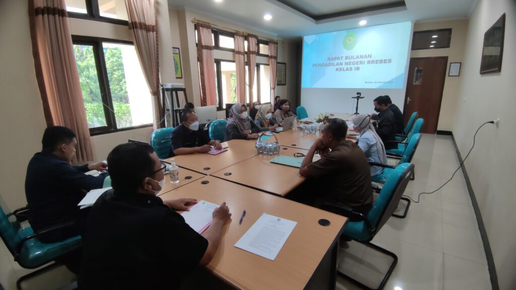 Pengadilan Negeri Brebes Kelas IB melaksanakan Kegiatan Rapat Bulanan di Ruang Command Center. Rapat Bulanan ini dipimpin langsung oleh Ketua Pengadilan Negeri Brebes Bapak Tornado Edmawan, S.H., M.H. didampingi Wakil Ketua Pengadilan Negeri Brebes Bapak Dr. Dedy Muchti Nugroho, S.H., M.Hum. serta dihadiri oleh Para Hakim, Panitera, Sekretaris, Panitera Muda Pidana, Panitera Muda Perdata, Panitera Muda Hukum, kemudian Kasubbag Kepegawaian & Ortala, Kasubbag Umum & Keuangan dan Kasubbag PTIP.