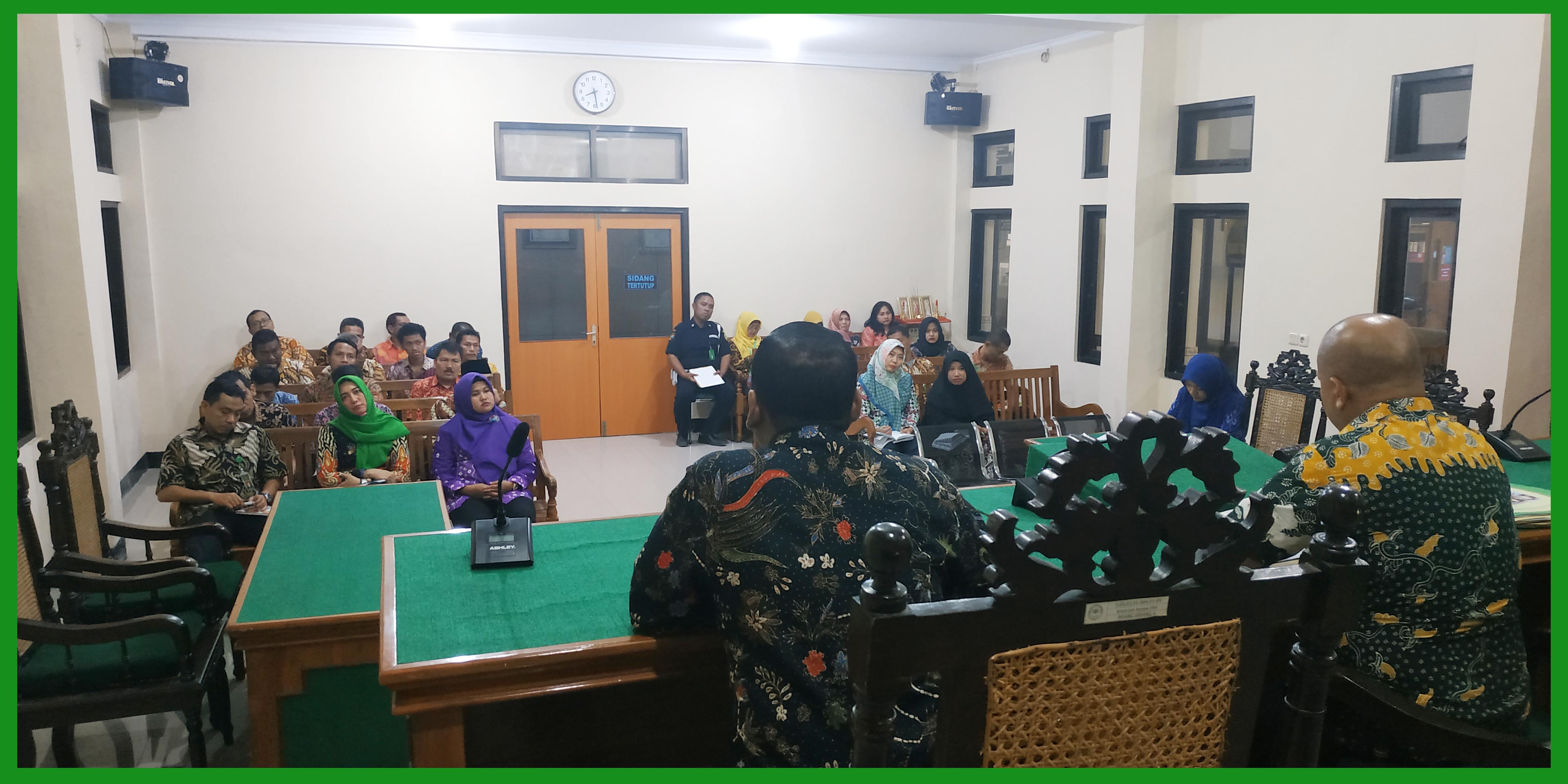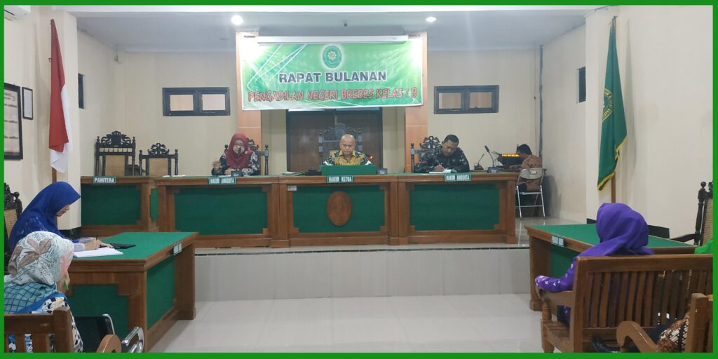 (Brebes, 03 Oktober 2019) Bertempat di ruang sidang Cakra Pengadilan Negeri Brebes, segenap Hakim, Pejabat struktural, Panitera Pengganti, Karyawan/Karyawati, dan Honorer menghadiri rapat rutin bulanan di bulan Oktober 2019. Dalam rapat tersebut dipimpin oleh Ketua Pengadilan Negeri Brebes Bpk. Edi Saputra Pelawi, SH,.MH. yang didampingi oleh Panitera Pengadilan Negeri Brebes Bpk. Abdul Kadir Djailani, SH. dan Sekretaris Pengadilan Negeri Brebes Ibu Rr. Sarsanti Kartika Dewi, SH. Pada rapat tersebut ketua PN selaku pimpinan rapat menyampaikan terima kasih dan apresiasi terhadap kinerja pegawai di bulan September. Dan diharapkan untuk lebih meningkatkan lagi agar menjadi lebih baik. Serta memberikan penilaian kinerja pegawai dan kinerja dari masing – masing bagian yang ada di Pengadilan Negeri Brebes.