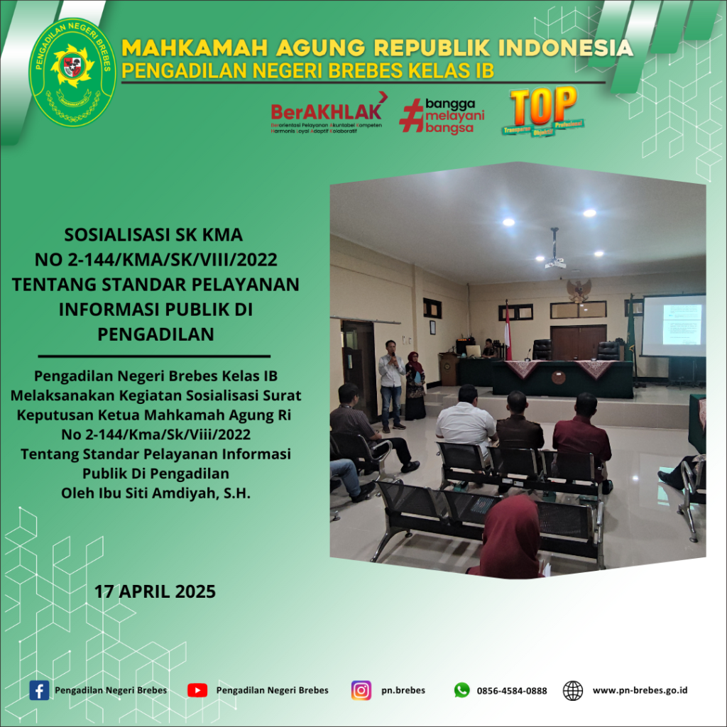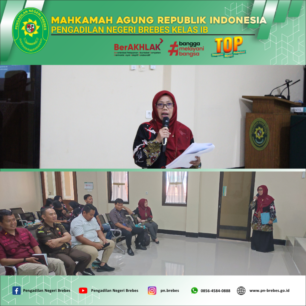 Pengadilan Negeri Brebes Kelas IB Melaksanakan Kegiatan Sosialisasi Surat Keputusan Ketua Mahkamah Agung RI No 2-144/Kma/Sk/Viii/2022 Tentang Standar Pelayanan Informasi Publik Di Pengadilan Oleh Ibu Siti Amdiyah, S.H.