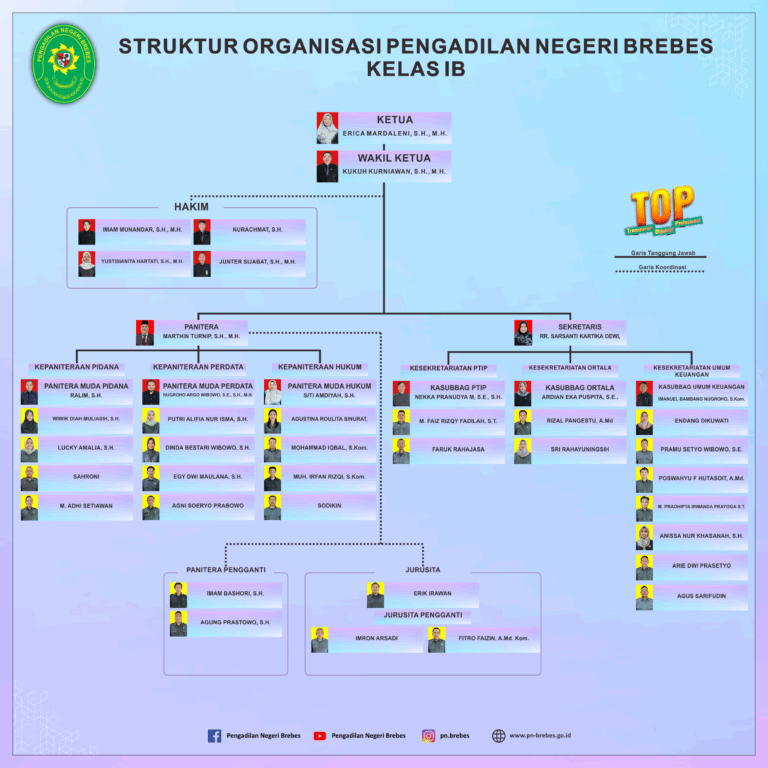 Dengan demikian, Pengadilan Negeri Brebes berfungsi memberikan pelayanan bagi masyarakat pencari keadilan di bidang Peradilan Umum, mengadili menurut hukum dengan tidak membeda-bedakan orang, dan berusaha mengatasi segala hambatan dan rintangan untuk dapat tercapainya peradilan yang sederhana, cepat, dan biaya ringan.