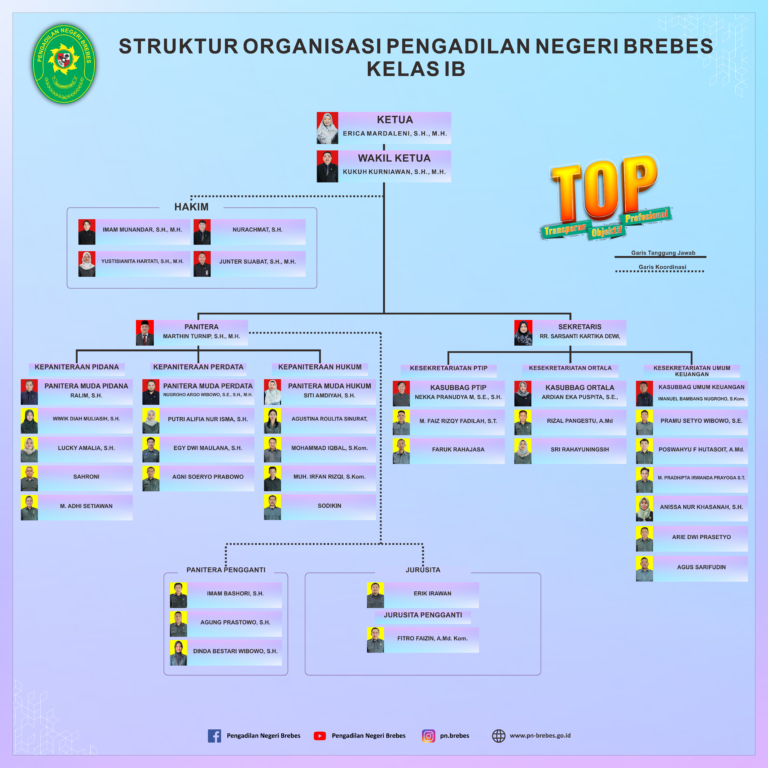 Pengadilan Negeri Brebes dipimpin oleh seorang Ketua dan dibantu oleh seorang Wakil Ketua serta Hakim-hakim yang melakukan pengawasan dan bertugas serta bertanggung jawab atas terselenggaranya Peradilan dengan baik dan menjaga terpeliharanya citra dan wibawa Pengadilan yang didukung oleh keamanan dan kehendak baik dari Pimpinan Struktural dan Pejabat Peradilan lainnya.