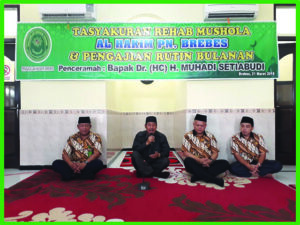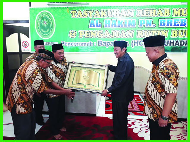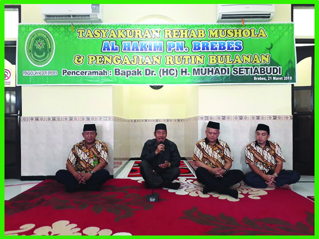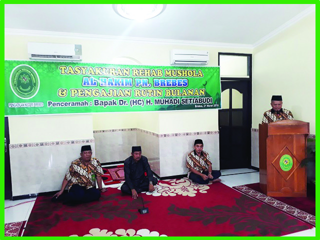 (Brebes, 21 Maret 2019) Bertempat di Mushola Al-Hakim Pengadilan Negeri Brebes diadakan Tasyakuran Rehab Mushola Al-Hakim PN Brebes yang dihadiri PN Brebes Bpk. Edi Saputra Pelawi, SH.MH, segenap Hakim, Pejabat Struktural dan Fungsional, Karyawan/ti, dan Honorer PN Brebes serta Bpk. Dr. (HC) H. Muhadi Setiabudi. Dalam Acara Tasyakuran diadakan Pengajian dan Setelahnya Memberikan Kenang-Kenangan Kepada Bpk. Dr. (HC) H. Muhadi Setiabudi sebagai ucapan Terima Kasih atas sumbangsinya dalam membantu Merehab Mushola Al-Hakim PN Brebes menjadi lebih Bagus lagi. Acara Tersebut Diakhiri dengan Salam-salaman oleh semua Jajaran PN Brebes serta Makan-makan.