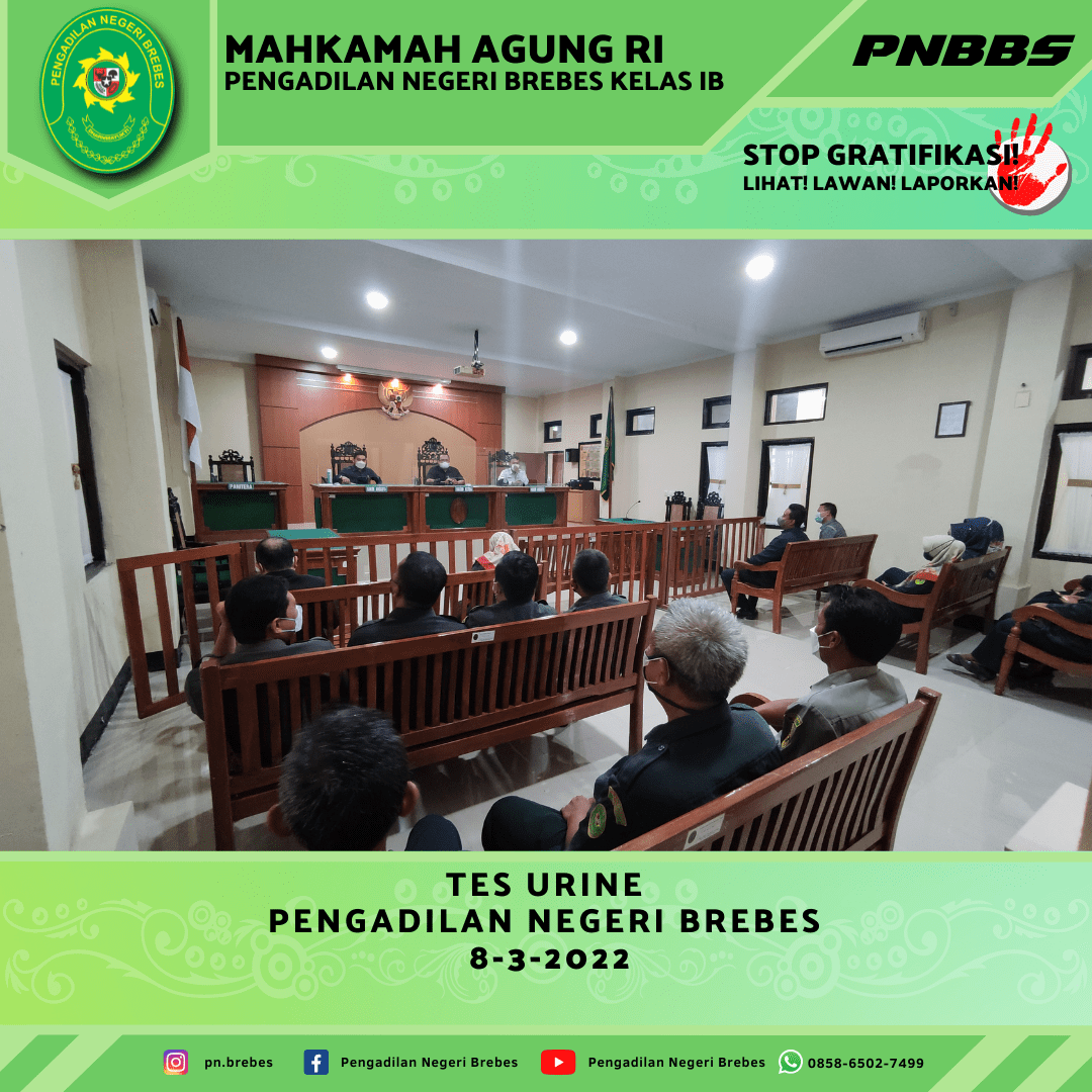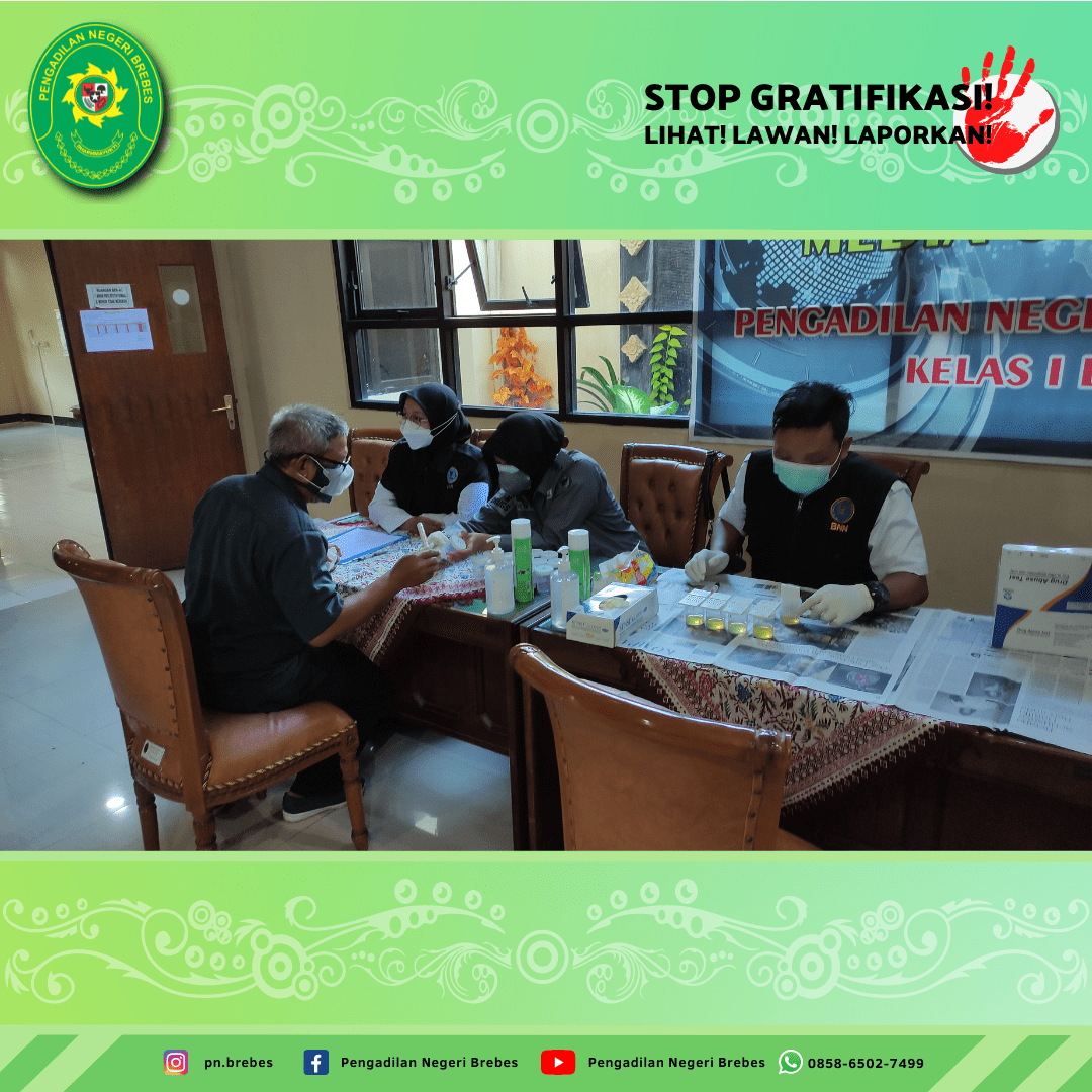 Pengadilan Negeri Brebes Kelas IB melaksanakan kegiatan Tes Urine untuk seluaruh pegawai Pengadilan Negeri Brebes. Pelaksanaan Tes Urine ini dilakukan oleh Badan Narkotika Nasional Republik Indonesia Kota Tegal. Kegiatan ini diikuti oleh Hakim, Pegawai, serta PPNPN Pengadilan Negeri Brebes dengan semua hasil Negatif.